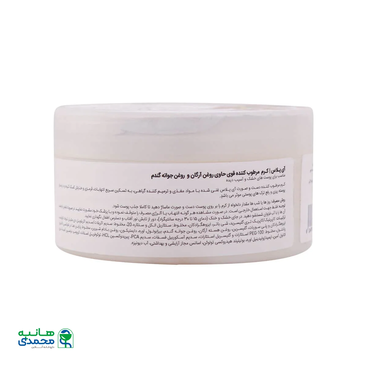 کرم مرطوب کننده روغن آرگان آی پلاس مناسب پوست دست و صورت بوده و رطوبت پوست را به مدت طولانی حفظ می‌کند. روغن آرگان، روغن جوجوبا و شی باتر از ترکیبات نرم کننده موثر در این کرم هستند.