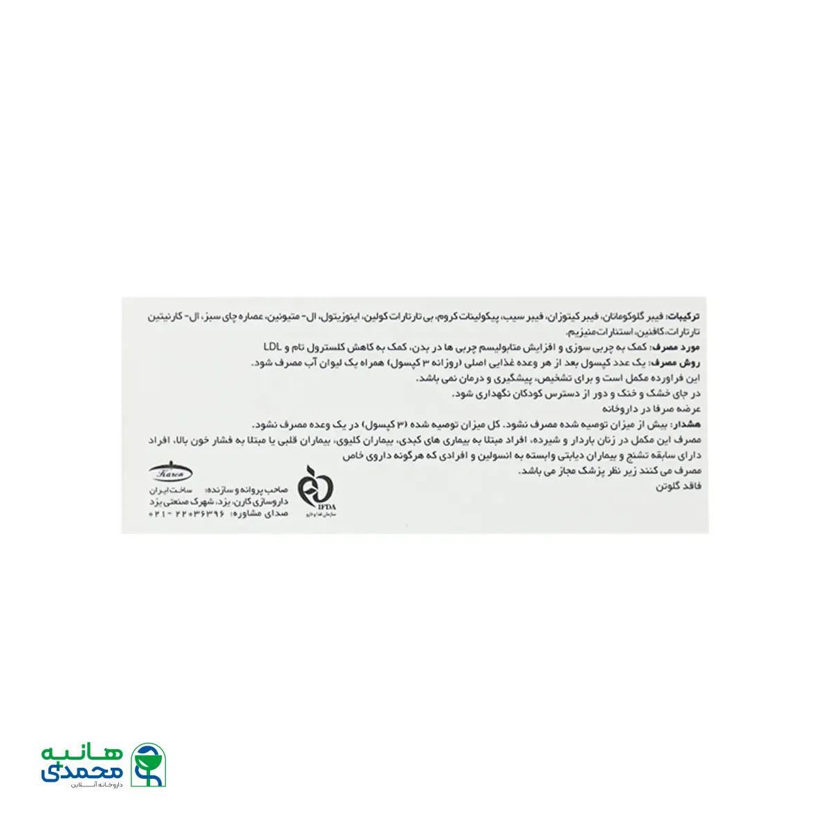 فیبر پسیلیوم، فیبر گلوکومانان،فیبر کیتوزان، فیبر سیب، پیکولینات کروم، بی تارتارات کولین، اینوزیتول، ال-متیونین، عصاره چای سبز، ال-کارنیتین، کافئین، اسنئارات منیزیم، ژلاتین (کپسول)
