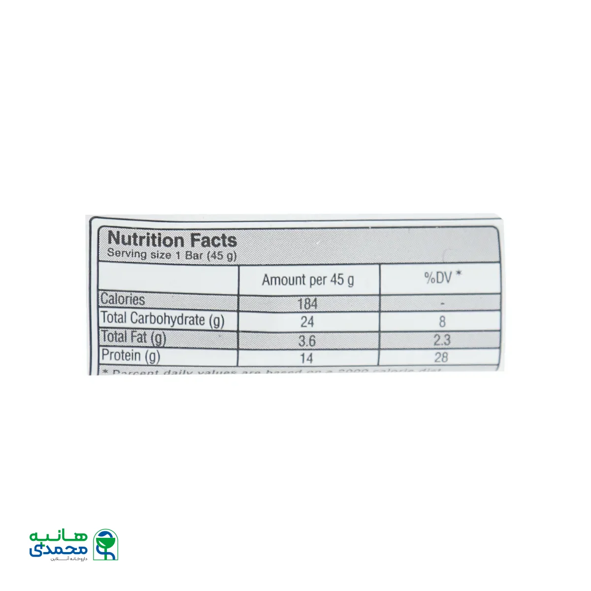 کنستانتره پروتئین آب پنیر، پروتئین ایزوله سویا، کنستانتره پروتئین شیر، پودر خرما، روغن نباتی، مالتودکسترین، شربت ذرت یا فروکتوز بالا، مجموع ویتامینها و مواد معدنی، روکش شکلاتی، گلیسیرین، لسیتین سویا، طعمدهندههای مجاز، گلیسیرین