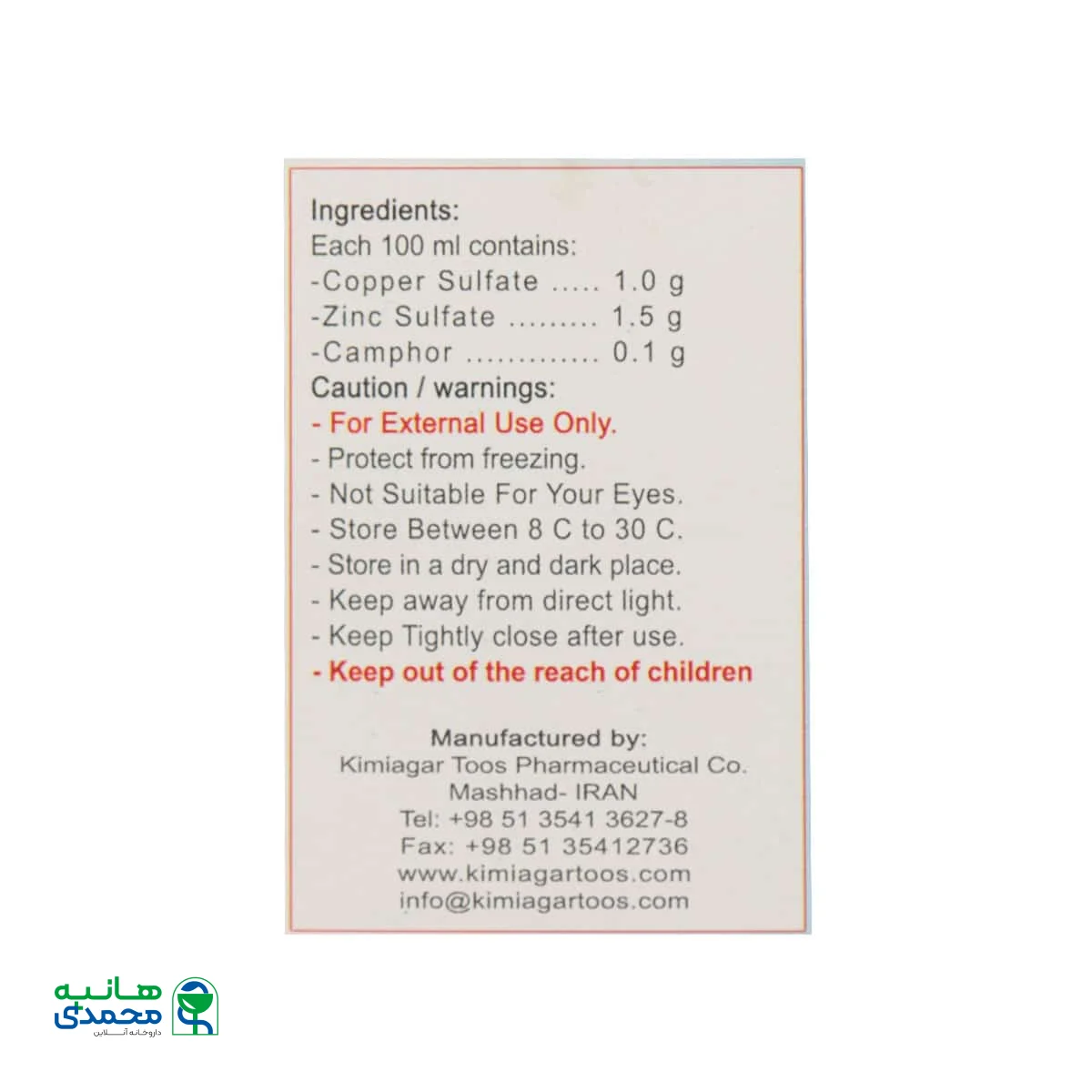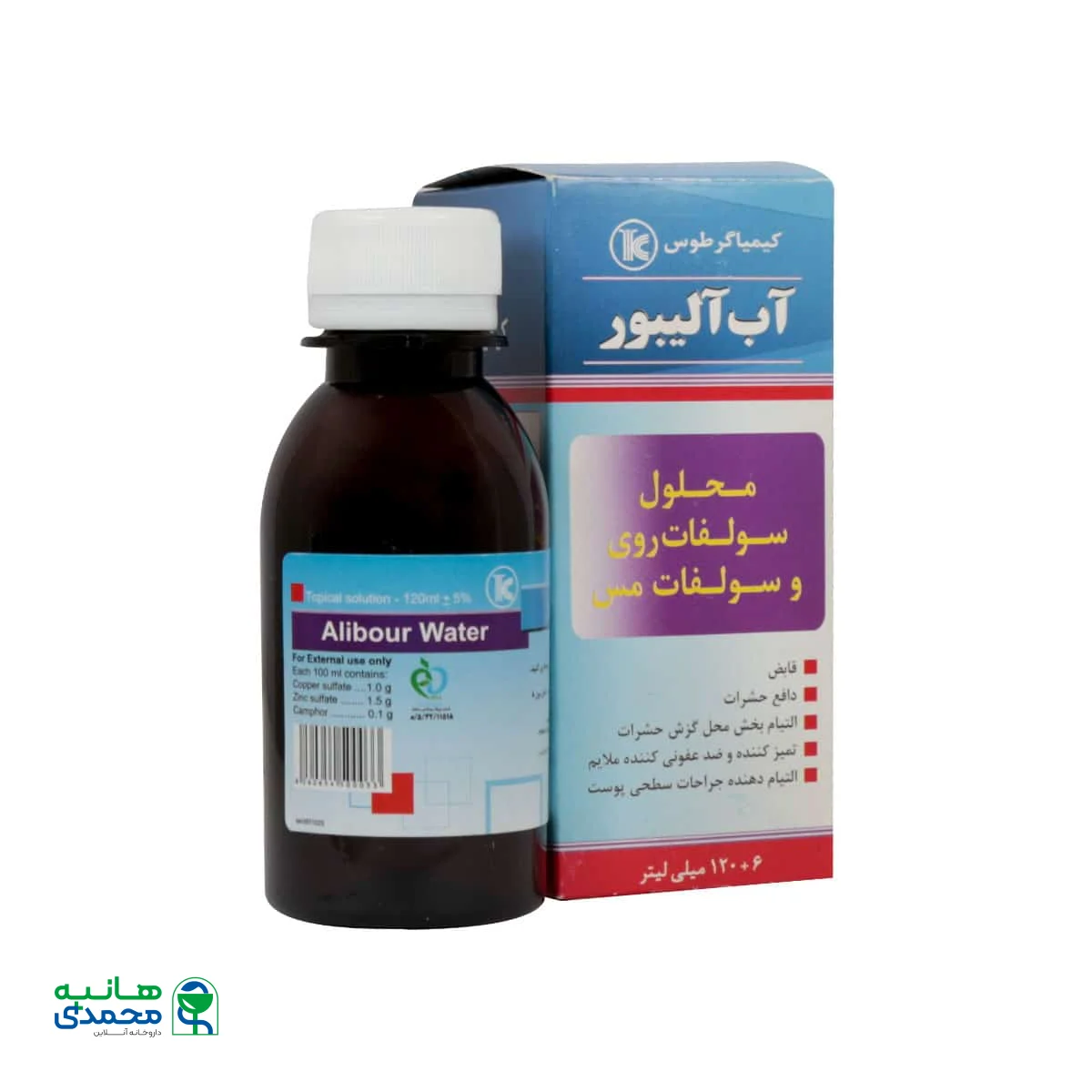 در محلول آب آلیبور کیمیاگر طوس ترکیباتی مانند سولفات روی، سولفات مس و کامفر وجود دارد. این لوسیون در اگزما، زرد زخم و التهاب‌ها به عنوان مرطوب کننده استفاده شده و دارای اثرات قابض و مسکن موضعی است. همچنین دافع حشرات و التیام دهنده محل گزش حشرات نیز هست. سولفات مس موجود در این محصول خاصیت قابض روی بافت‌های مخاطی را داردوسولفات روی نیز دارای خاصیت آنتی سپتیک و کامفر بوده و به عنوان مسکن موضعی و دافع حشرات استفاده می‌شود.