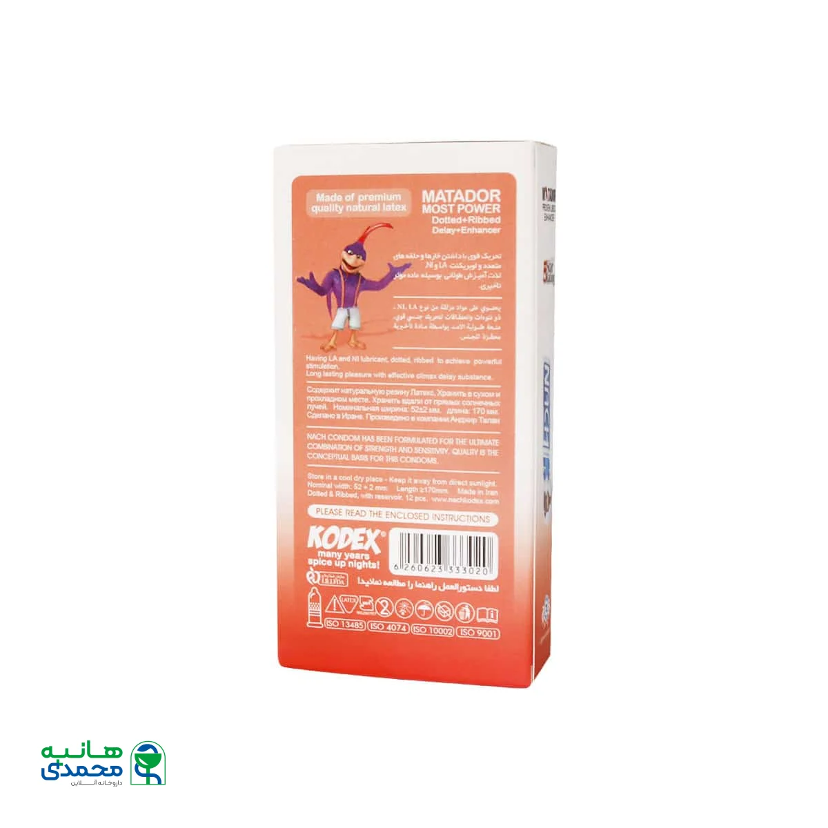 کاندوم ماتادور کدکس از لاتکس کاملا طبیعی ساخته شده و با رایحه مطبوع موجب به یاد ماندنی شدن رابطه میشود. برند ناچ کدکس تنها برندی کاندومی است که محصولات خود را از لاتکس 100 درصد طبیعی تولید میکند. در نتیجه کاملا ضد حسایت بوده و هیچ نوع ماده پلاستیکی در آن استفاده نشده است. به علاوه این نوع ماده خاصیت ارتجاعی فوقالعادهای داشته و در واژن جا نمیماند یا پاره نمیشود. شما میتوانید برای خرید محصولات جنسی و مشاهده قیمت آنها به دسته بندی مربوطه در سایت دکتر هانیه محمدی مراجعه کنید.