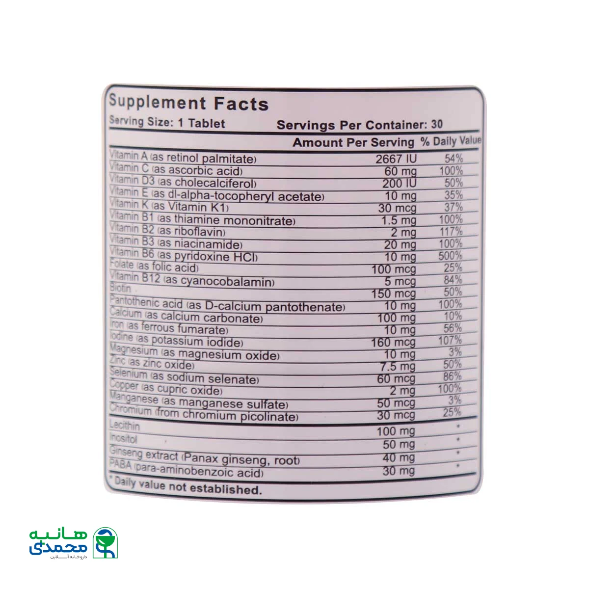 | ویتامین C (آسکوربیک اسید) | 60mg | 100% |