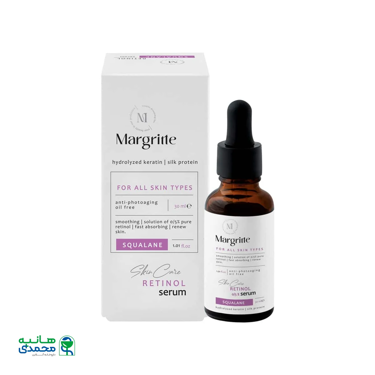 سرم رتینول مارگریت یکی از محصولات محبوب در حوزه مراقبت از پوست است که به دلیل خواص ضد پیری و جوانسازی شناخته شده است. این سرم با بهرهگیری از قدرت رتینول که یکی از موثرترین ترکیبات ضد پیری است به بهبود بافت پوست و کاهش علائم پیری کمک میکند. در این سرم علاوه بر رتینول، دیگر ترکیبات همچون آلانتوئین، پروتئین هیدرولیز شده ابریشم و پروتئین هیدرولیز شده کراتین وجود دارد. آلانتوئین موجود در این محصول دارای خاصیت رطوبت رسانی و تسکین دهندگی بسیار بالایی است و از قرمزی، سوزش، خارش و التهاب جلوگیری میکند.