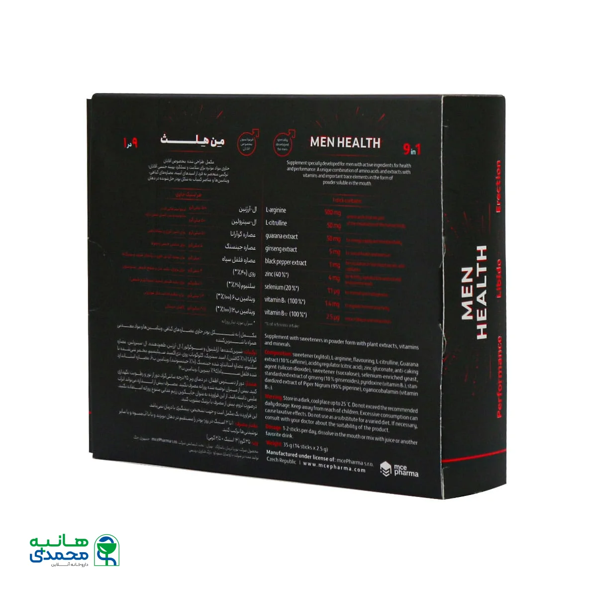 ساشه من هلث 9 در 1 ام سی ای فارما با داشتن ترکیبات موثری مانند اسیدهای آمینه، عصاره‌های گیاهی، ویتامین‌ها و مواد معدنی همراه با شیرین کننده یک مکمل مناسب جهت تقویت میل جنسی آقایان و بهبود اختلالات نعوظ است. این محصول به شکل 14 استیک یا همان پودر قابل جذب در دهان طراحی شده است و شکل جذب آن سبب شده است تا اثرگذاری آن افزایش پیدا کند. از دیگر فواید من هلث ام سی ای فارما می‌توان به تقویت سیستم عصبی عضلانی بدن، تقویت سیستم ایمنی بدن، افزایش انرژی جسمی و … اشاره کرد.