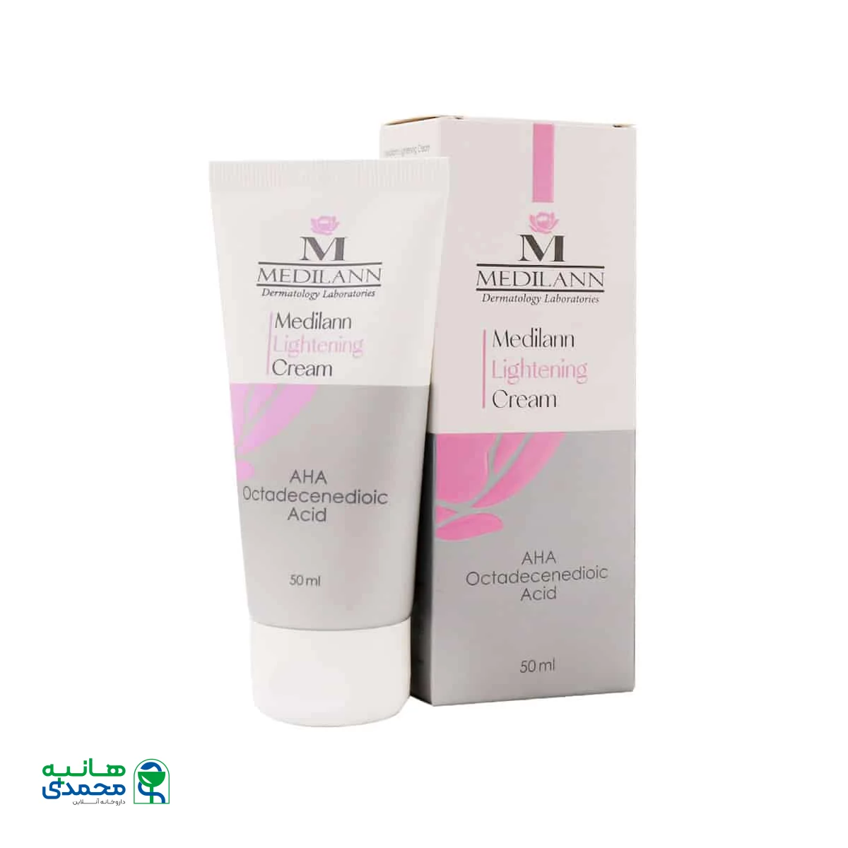 - AHA 10%: آلفا هیدروکسی اسید به صورت کمپلکسی از چند اسید میوه فرآیند لایه برداری از اپیدرم، روشن سازی، جوان سازی، تحریک تولید سلولهای جدید و افزایش رطوبت پوست را در بردارد. همچنین افزایش کلاژن سازی و کاهش چروکهای پوستی از دیگر فواید این ماده است. کرم لایه بردار مدیلن صورتی باعث مهار آنزیم تیروزیناز باعث کاهش سنتز ملانین شده و سبب بی رنگ شدن تدریجی لکها روی پوست است.