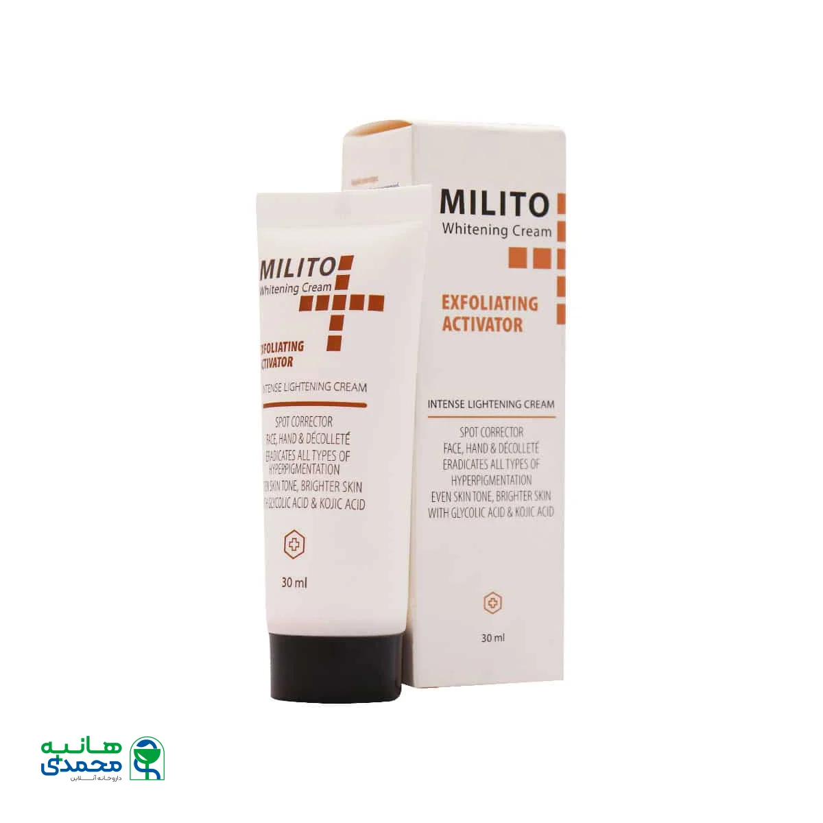 کرم ضد لک میلیتو با داشتن ترکیبات موثری مانند عصاره شیرین بیان، آربوتین، آسکوربیک اسید و … برای رفع انواع لک روی پوست مانند لکهای حاصل از کاهش وزن، زایمان، بارداری، تابش نور خورشید و کک و مک قوی و موثر است. این محصول علاوه بر از بین بردن لکها در روشن و یکنواخت شدن رنگ پوست شما هم نقش دارد و بهترین راه حل برای درمان لکهای پوستی به شمار میآید. این محصول بافت سبکی دارد و به سرعت جذب پوست میشود تا بیشترین تاثیر را داشته باشد.