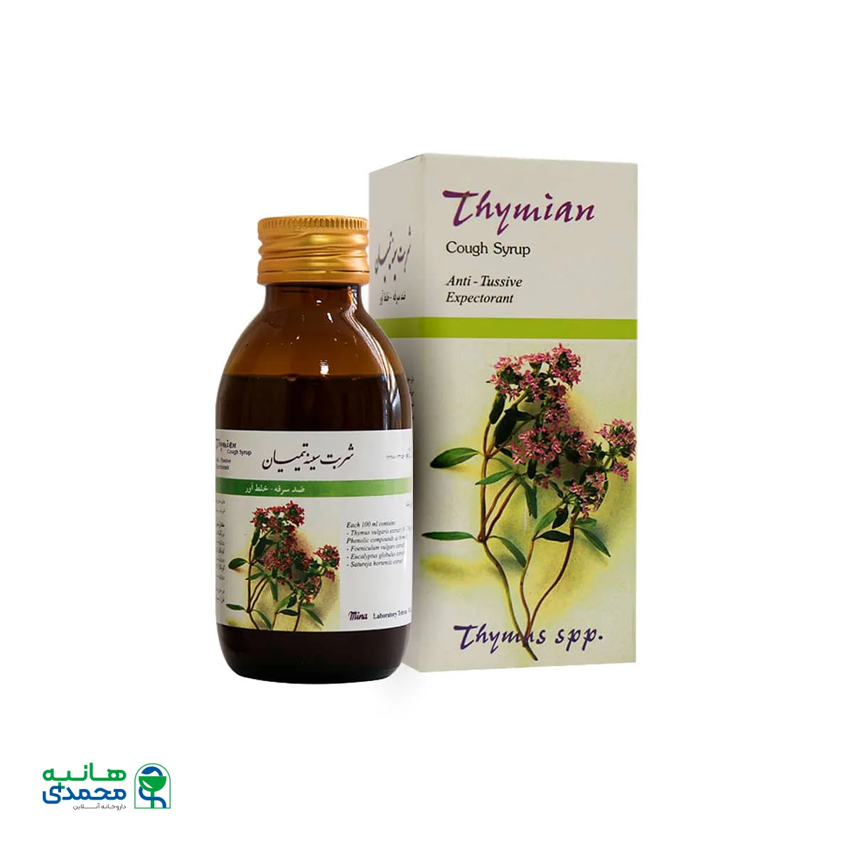 شربت تیمیان تهیه شده از ترکیبات گیاهی موثر در درمان سرفه و رفع علایم برونشیت با خاصیت خلط آور (اکسپکتورانت) است. این شربت ضد سرفه گیاهی به راحتی قابل جایگزینی با داروهای شیمیایی است. با توجه به این نکته که عوارض بسیار کمتری نسبت به داروهای شیمیایی خواهد داشت. شریت تیمیان حاوی عصاره گیاهان آویشن، مرزه، اکالیپتوس و رازیانه بوده و دارای خواصی به شرح زیر است: