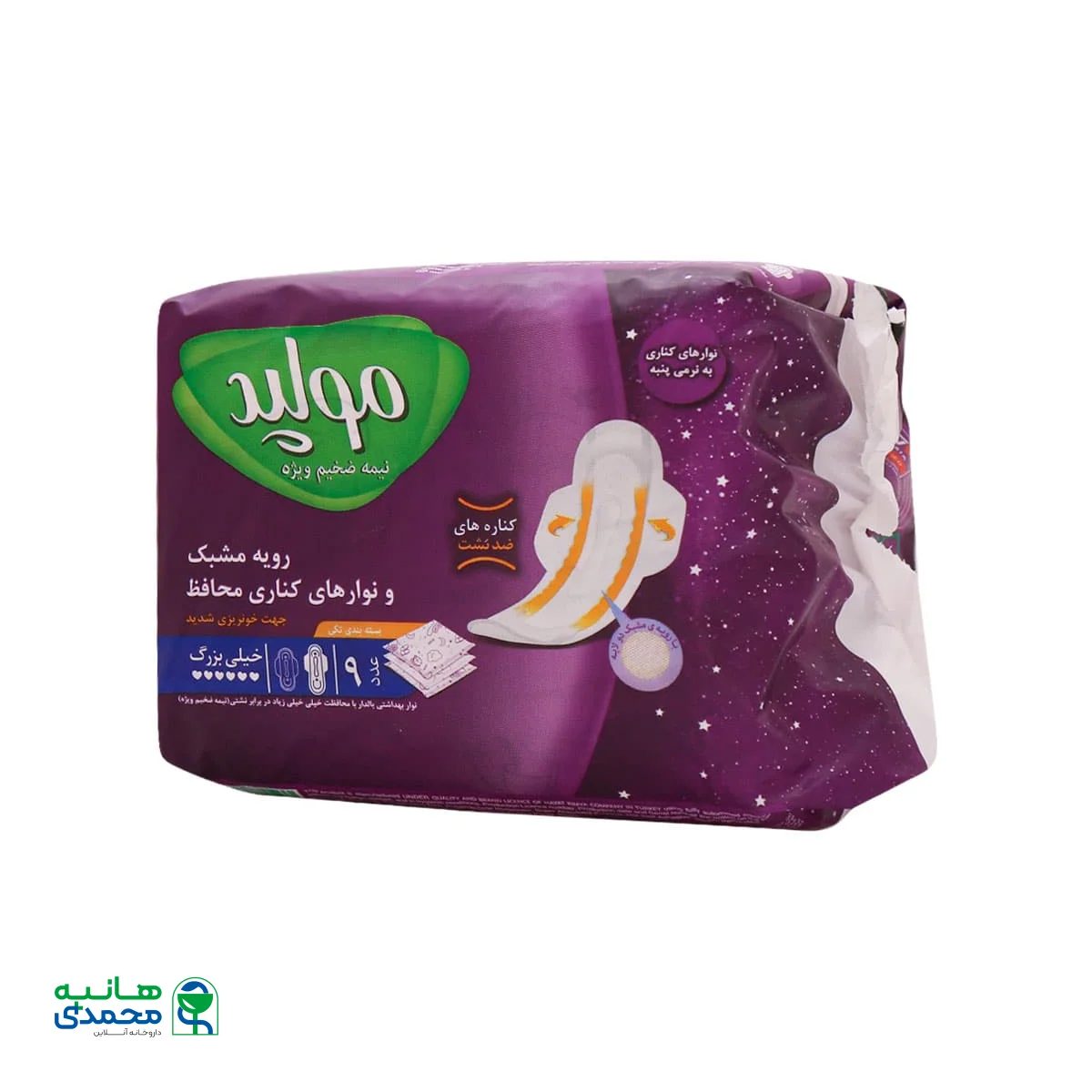 بسته بندی تکی چسب دار نوار بهداشتی بالدار نیمه ضخیم ویژه مشبک مولپد سایز خیلی بزرگ، حمل و نهایتا دور انداختن آن را به کاری بی دردسر تبدیل کرده است و استفاده از آن را برای مشتریان آسان نموده است. این محصول تحت لیسانس شرکت حیات کیمیا در کشور ترکیه بوده و بدون دخالت دست و با استفاده از دستگاههای تمام اتوماتیک، در شرایط کاملا بهداشتی تولید میشود.