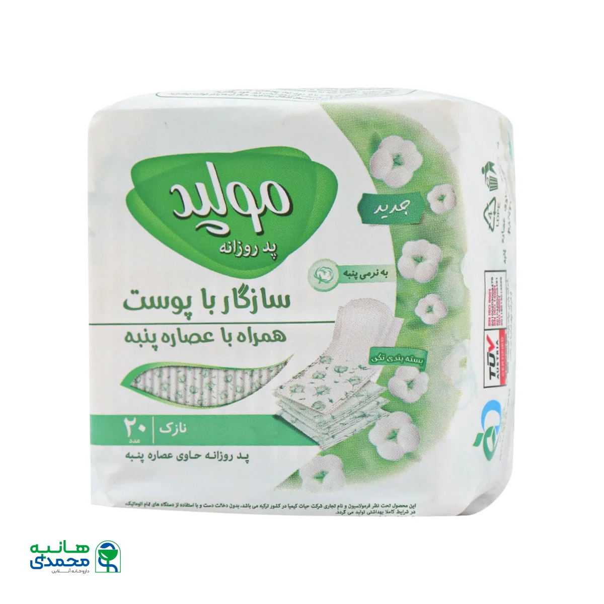پد روزانه نازک مولپد همراه با عصاره پنبه بسیار نرم بوده و مانع از نشت ترشحات داخل واژن به لباس‌های زیرین می‌شود. این پد عبور هوا از تمامی جهات را مقدرو ساخته و از بروز حساسیت در ناحیه تناسلی جلوگیری می‌کند.