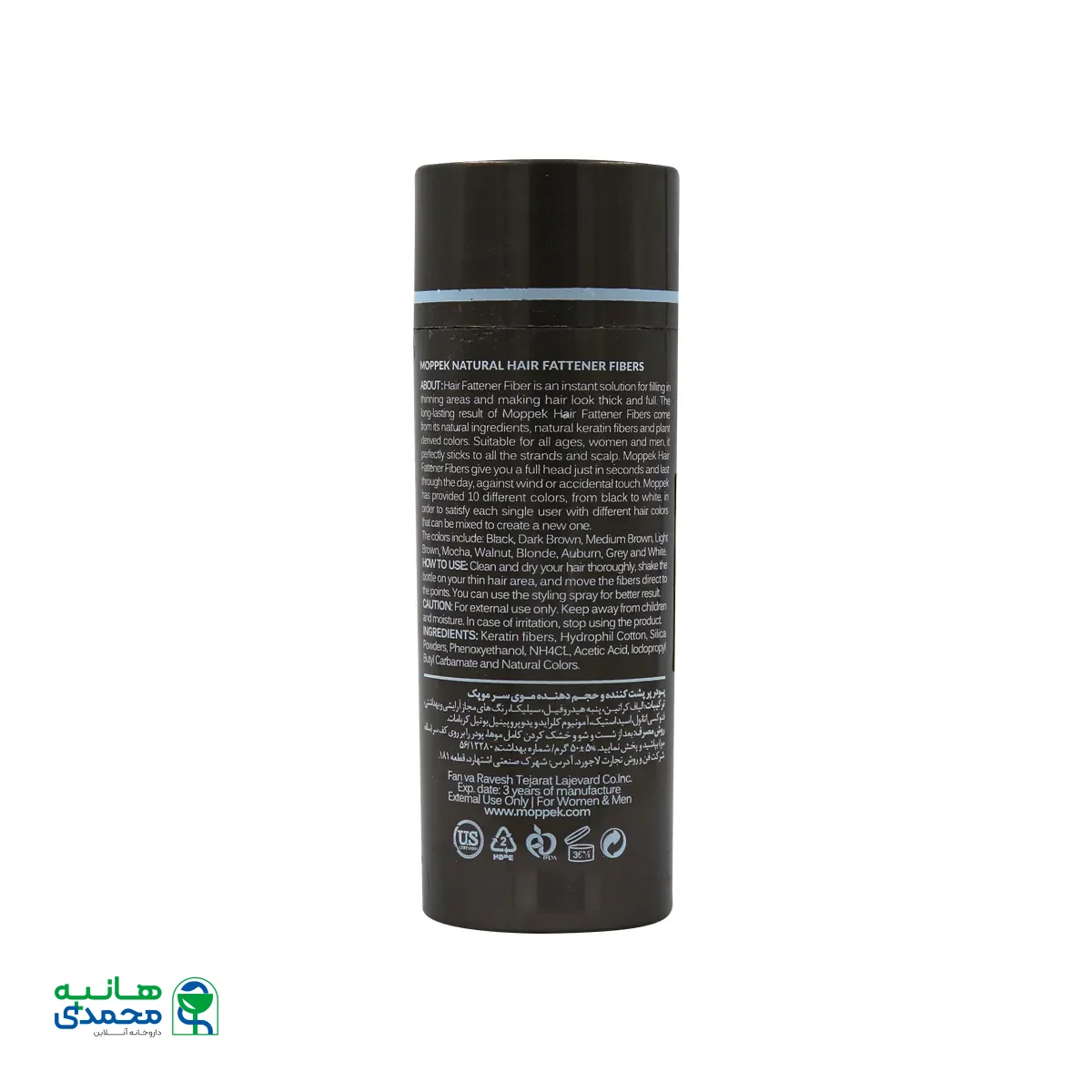 پودر پرپشت کننده موی قهوه ای تیره موپک پرپشت کننده و حجم دهنده موی سر با خرده های الیاف بسیار کوچکی ست که با استفاده از تکنولوژی بسیار پیشرفته به دانه های باردار مغناطیسی تبدیل می شوند و همانند خرده های آهن که به آهن ربا می چسبند به موهای کم پشت متصل شده و آن را پرپشت تر و زیباتر جلوه می دهند. رنگ تیره استفاده شده در این محصول از نوع گیاهی می باشند. این محصول به دلیل استفاده خارجی کوچکترین خطری برای مصرف ندارد و استفاده موقت آن اثرات جانبی را به حداقل می رساند. بهتر است جهت نتیجه گیری بهتر و چسبندگی همراه با این محصول از اسپریهای حالت دهنده استفاده نمایید. در این صورت ظاهر بهتری ایجاد خواهد شد.