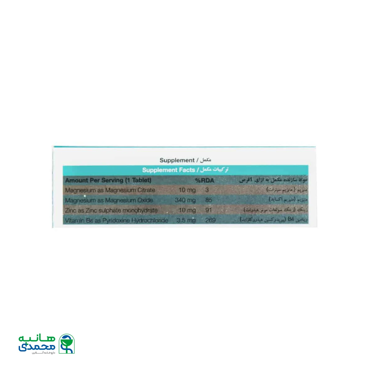 - حاوی منیزیم استئارات، منیزیم اکساید، زینک سولفات مونوهیدرات و ویتامین B6