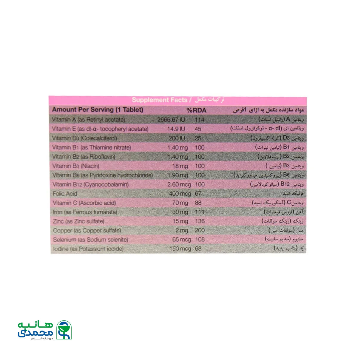 | ویتامین B6 (پیروکسیدین هیدروکلراید) | 1.90mg | 100 |