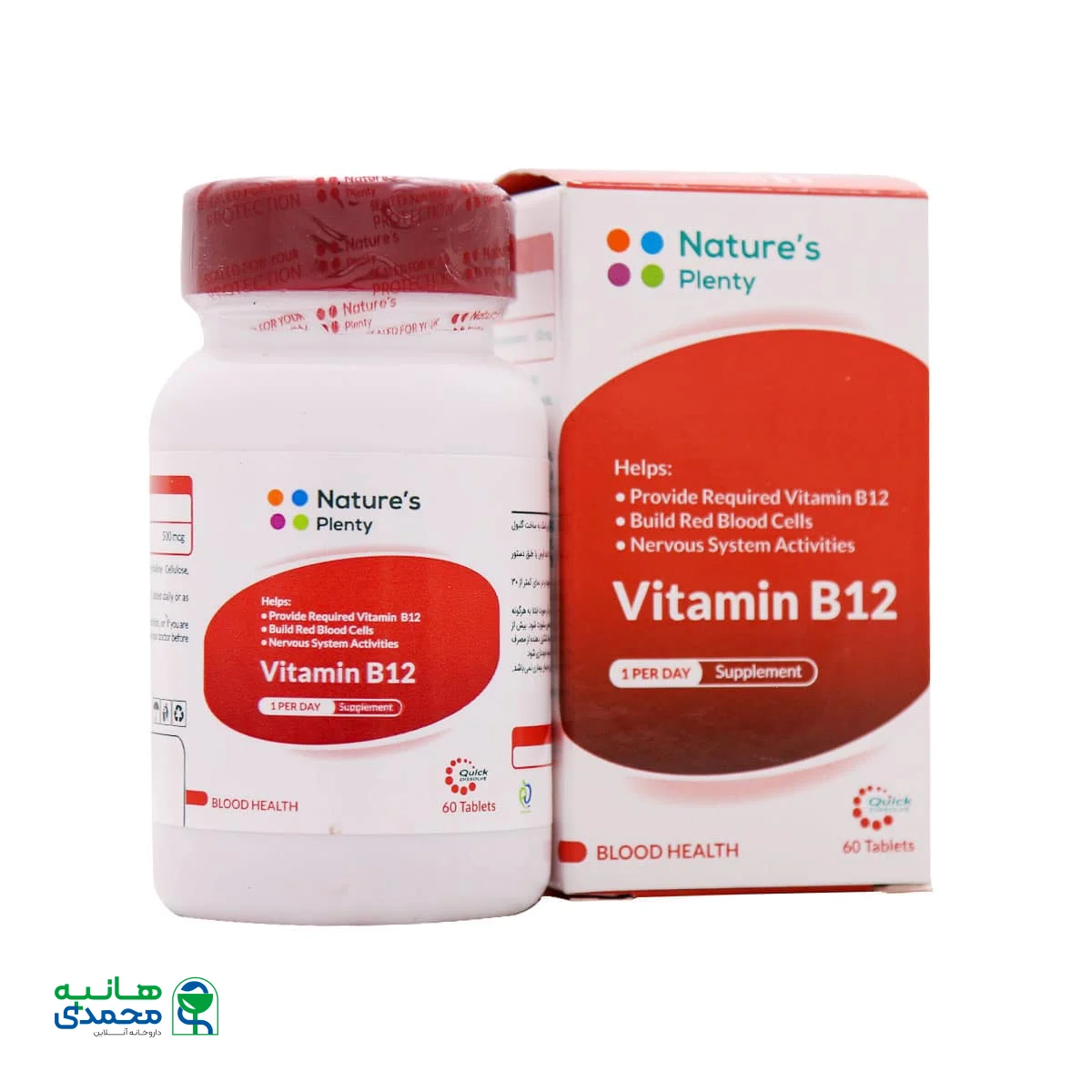 قرص ویتامین B12 500 میکروگرم نیچرز پلنتی یک مکمل مناسب جهت تامین ویتامین ب12 مورد نیاز بدن و ساخت گلبول‌های قرمز خون است. ویتامین ب12 به عنوان یک کوآنزیم در واکنش‌های حیاتی بدن مانند خون سازی، رشد سلول‌های بدن و تولید گلبول قرمز نقش مهمی دارد. خرید قرص ویتامین B12 و مصرف آن به رفع کمبود ویتامین ب12، پیشگیری و درمان کم خونی ناشی از کمبود ویتامین ب12، افزایش سطح انرژی، کاهش خستگی و حفظ سیستم عصبی کمک می‌کند. به طور کلی می‌توان گفت قرص ویتامین ب 12 نیچرز پلنتی به عنوان یک منبع غنی از این ویتامین ارزشمند به حمایت از سلامت عمومی و قلب و عروق فرد می‌پردازد.