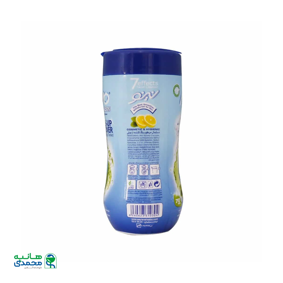 دستمال مرطوب پاک کننده آرایش نینو بدون برجای گذاشتن اثر آرایش، به سرعت آن را پاک کرده و پوست را نرم و مرطوب می‌کند. این محصول حاوی عصاره آلوئه ورا، خیار، لیمو و بابونه است.