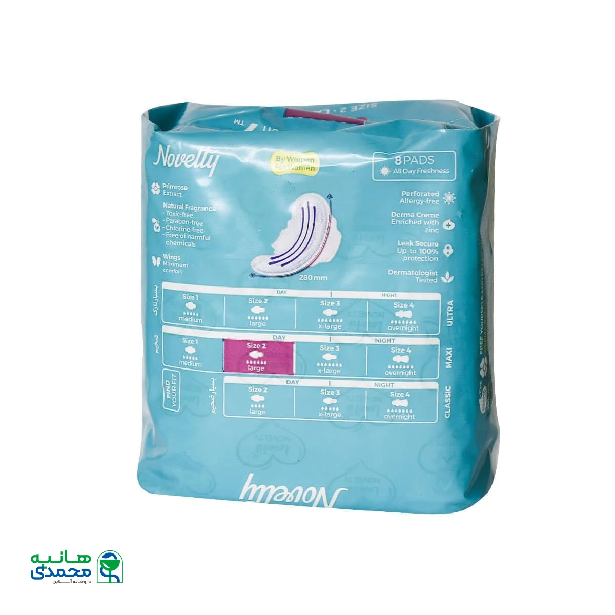 نوار بهداشتی سایز بزرگ مکسی ناولتی بر اساس مطالعه و درک ارگونومی بدن بانوان طراحی شده و به همین دلیل خانمها در طول زمان استفاده از آن احساس آرامش و راحتی خواهند داشت. این نوار بهداشتی ضخیم بوده و قدرت جذب 6 قطره را دارد. پدهای ناولتی مشبک و ضد حساسیت هستند زیرا در آنها از عصاره بنفشه مغربی و کرم زینک اکساید استفاده شده است. عصاره بنفشه مغربی از بروز التهابات پوستی پیشگیری کرده و کرم زینک اکساید نیز به جلوگیری از خشکی پوست کمک میکند. این محصول به دلیل حفاظت بیشتر و پیشگیری از انتقال آلودگی به لباس زیر، بالدار در نظر گرفته شده است. همان طور که گفته شد این نوار بهداشتی سایز بزرگ دارد و طول آن 280 میلی متر است. از مواد سمی، پارابن، کلراید و مواد مضر شیمیایی در این نوار بهداشتی استفاده نشده است و با خیالی آسوده میتوانید آن را مورد مصرف قرار دهید. به منظور رعایت بهداشت و راحتی بیشتر بهتر است هر 3 تا 4 ساعت یکبار (بسته به میزان خونریزی) نوار بهداشتی تعویض شود.