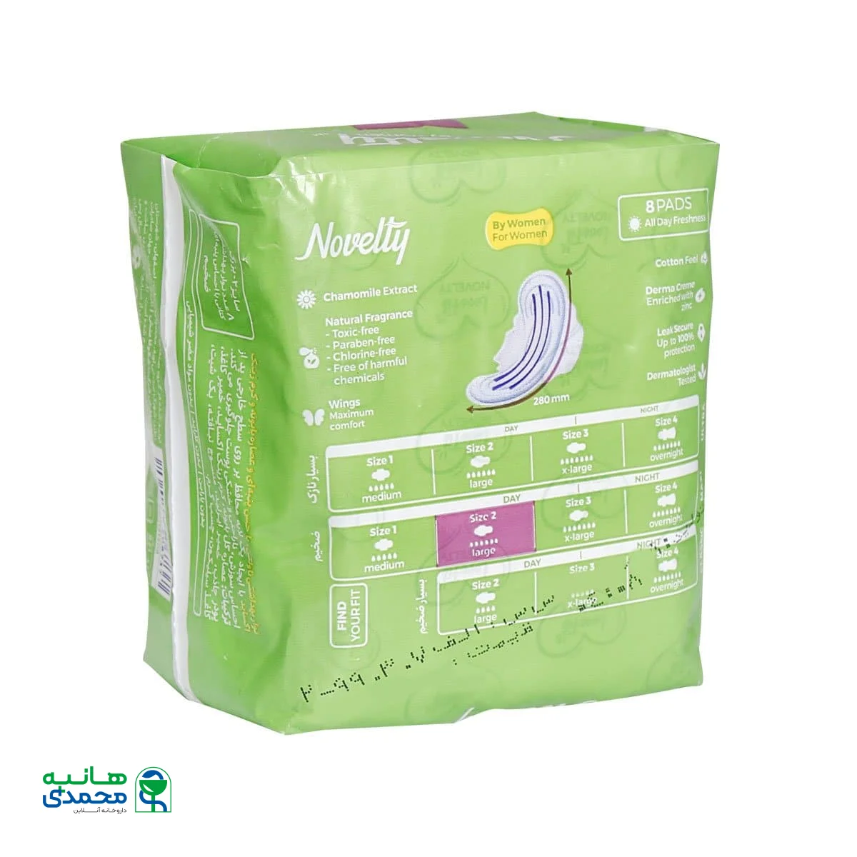 نوار بهداشتی کتانی سایز بزرگ مکسی ناولتی ضخیم است و قدرت جذب 6 قطره را دارد. این محصول بر اساس مطالعه و درک ارگونومی بدن بانوان طراحی شده و از این رو در زمان استفاده از آن احساسی خوشایند را به شما هدیه خواهد داد. به طور کلی توصیه میشود که به منظور رعایت بهداشت هر 3 تا 4 ساعت یکبار نوار بهداشتی خود را تعویض نمایید. استفاده از عصاره بابونه و کرم زینک اکساید در این نوار بهداشتی باعث شده تا به هنگام استفاده از سوزش، خشکی و دیگر ناراحتیهای پوستی ممانعت به عمل آید. استفاده از محصولات استاندارد و مرغوب سبب میشود تا در زمان عادت ماهیانه احساس راحتی داشته باشید و مشکلات پوستی نیز برای شما ایجاد نشوند. این محصول بدون مواد سمی، بدون پارابن، بدون کلراید و بدون مواد مضر شیمیایی فرموله شده است. این مدل از نوار بهداشتی Novelty 280 میلی متر طول دارد و بالدار بوده تا از لباس زیر شما محافظت به عمل بیاید.