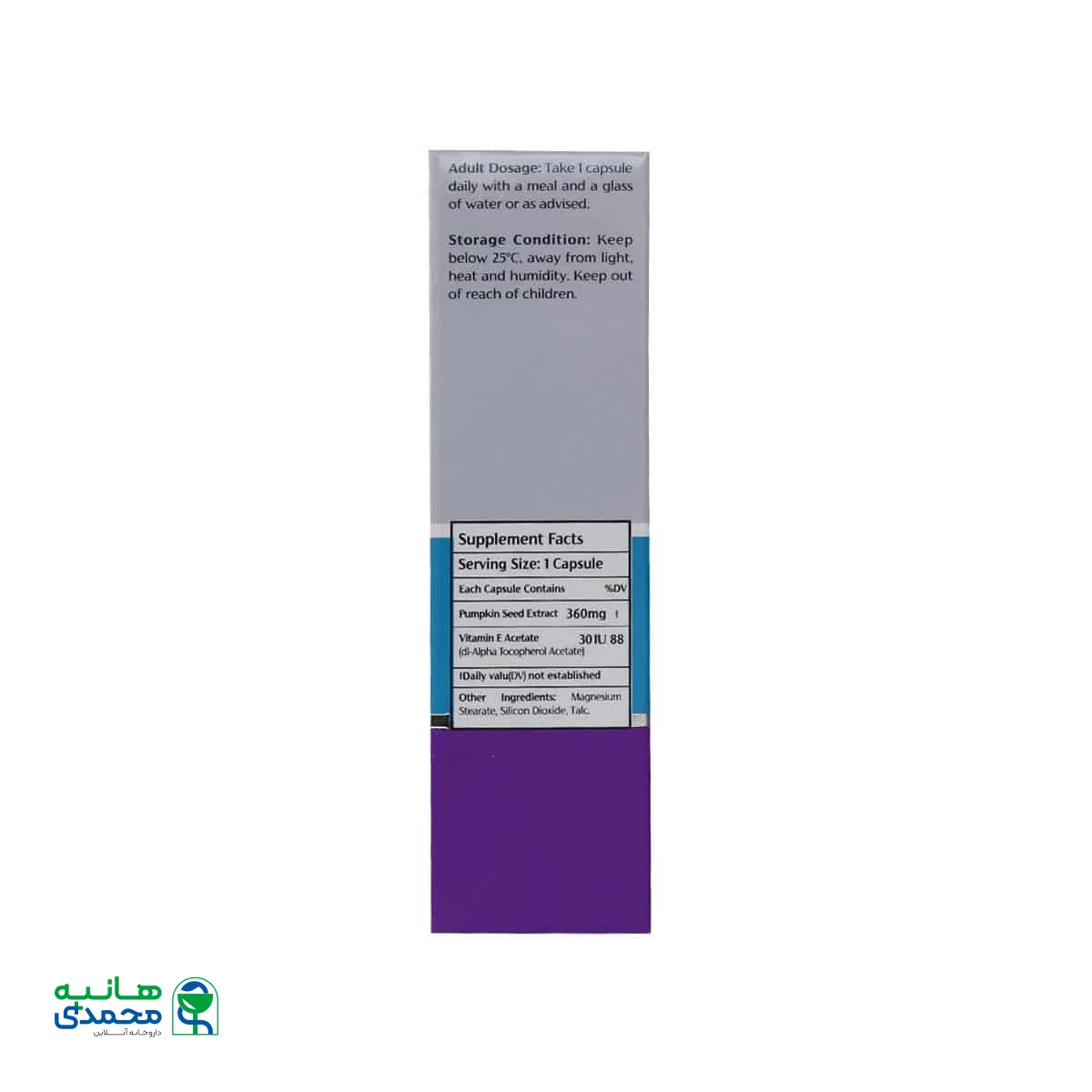 همان طور که می‌دانید ویتامین E از جمله آنتی اکسیدان‌های قوی است که مانع از اسید شدن اسیدهای چرب غیر اشباع می‌شود. همچنین از سلول‌های بدن در مقابل اثرات مخرب رادیکال‌های آزاد محافظت می‌نماید. مصرف روزانه قرص ویتامین E نقش موثری در کاهش احتمال بروز مشکلات پروستات از جمله بزرگ شدن آن دارد. این فرآورده فاقد سویا، شیر، گندم، تخم مرغ، گلوتن، هر گونه شیرین کننده و نگهدارنده است.