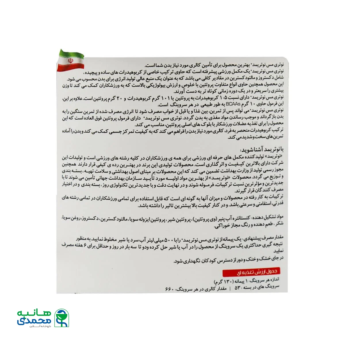 پودر سطلی نوتری مس نوتریمد یک مکمل تغذیهای با فرمولاسیون منحصر به فرد است که برای تامین انرژی و افزایش وزن طراحی شده است. این محصول ترکیبی خاص از کربوهیدراتها ساده و پیچیده دارد که به صورت مداوم انرژی مورد نیاز بدن را تامین میکنند و باعث میشوند که شما در طول روز و در زمانهای تمرینات شدید، انرژی خود را از دست ندهید. همچنین نوتری مس نوتریمد حاوی انواع متفاوت پروتئینها است که نقش مهمی در بازسازی عضلات و افزایش حجم عضلانی دارند. با مصرف این مکمل، نه تنها میتوانید کالری مورد نیاز بدن را به طور کامل تامین کنید، بلکه توانایی جسمی و ذهنی خود را برای انجام تمرینات سخت و طولانی بهبود خواهید داد. به صورت کلی، این محصول یک گزینه عالی برای کسانی است که به دنبال یک مکمل کامل و موثر برای حمایت از اهداف ورزشی و افزایش وزن هستند.