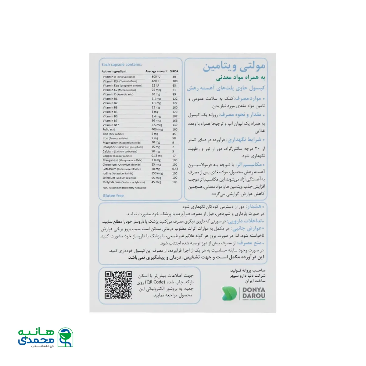 مولتی ویتامین وان ا دی حاوی پلت‌های آهسته رهش مولتی ویتامین مینرال که بهترین مکمل برای ارتقا سلامت عمومی بدن و رفع احساس کسالت و خستگی است. همچنین تامین کننده صد در صد نیاز روزانه بدن به ویتامین ها و مواد معدنی است.