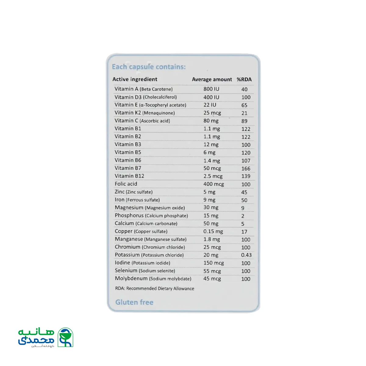 مولتی ویتامین وان ا دی بهترین مولتی ویتامین برای تامین انرژی مورد نیاز بدن در طول روز است. این کپسول بهترین محصول فرموله شده است که از فعالیت‌های طولانی مدت بدن پشتیبانی می‌کند، چرا که بدن ما به طور طبیعی از مقدار ویتامین‌های مورد نیاز به سرعت استفاده می‌کند و مازاد آن در بدن از بین می‌رود. قابل ذکر است استاندارد جذب ویتامین‌ها حداکثر تا سه ساعت پس از مصرف می‌باشد اما این محصول توانسته است این زمان را به ۸ ساعت افزایش دهد که گاهی تا ۱۶ ساعت نیز آزاد سازی ایمن انجام می‌گیرد. این محصول شامل 24 ویتامین و مواد معدنی مختلف و ویتامین K2 می‌باشد.