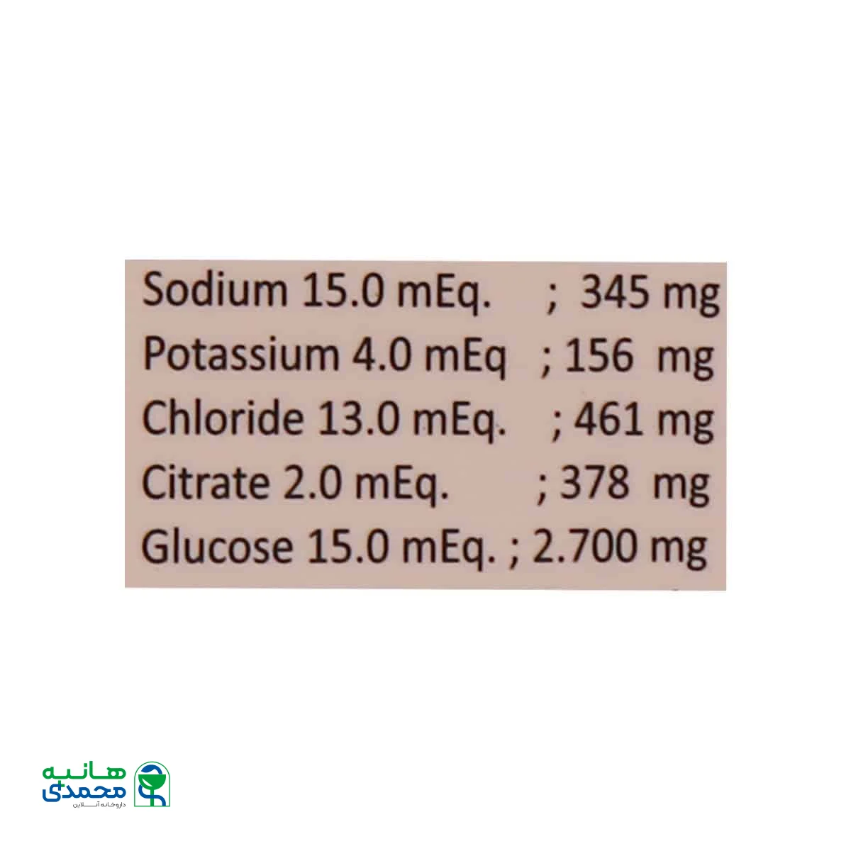در فرمولاسیون این محصول مقادیر قند و سدیم و پتاسیم، سیترات و کلراید کاملا مطابق با فرمولاسیون WHO است.