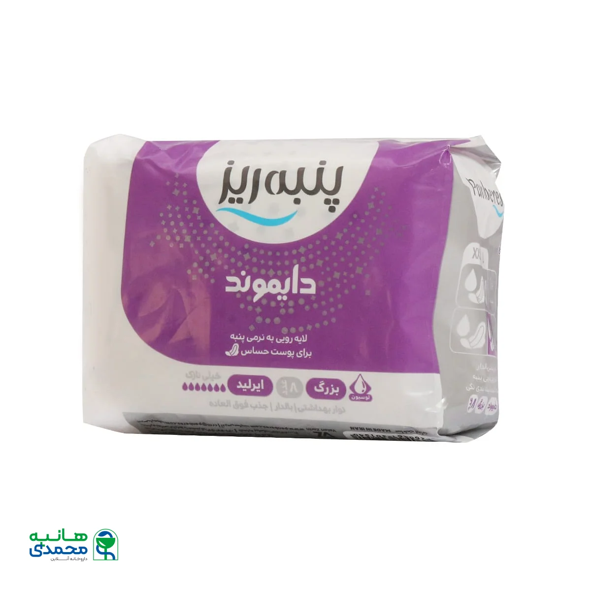 نوار بهداشتی بالدار خیلی نازک دایموند پنبه ریز مناسب پوست حساس سایز بزرگ 8 عددPanberes Diamond cotton very thin winged sanitary napkin 8 pcs