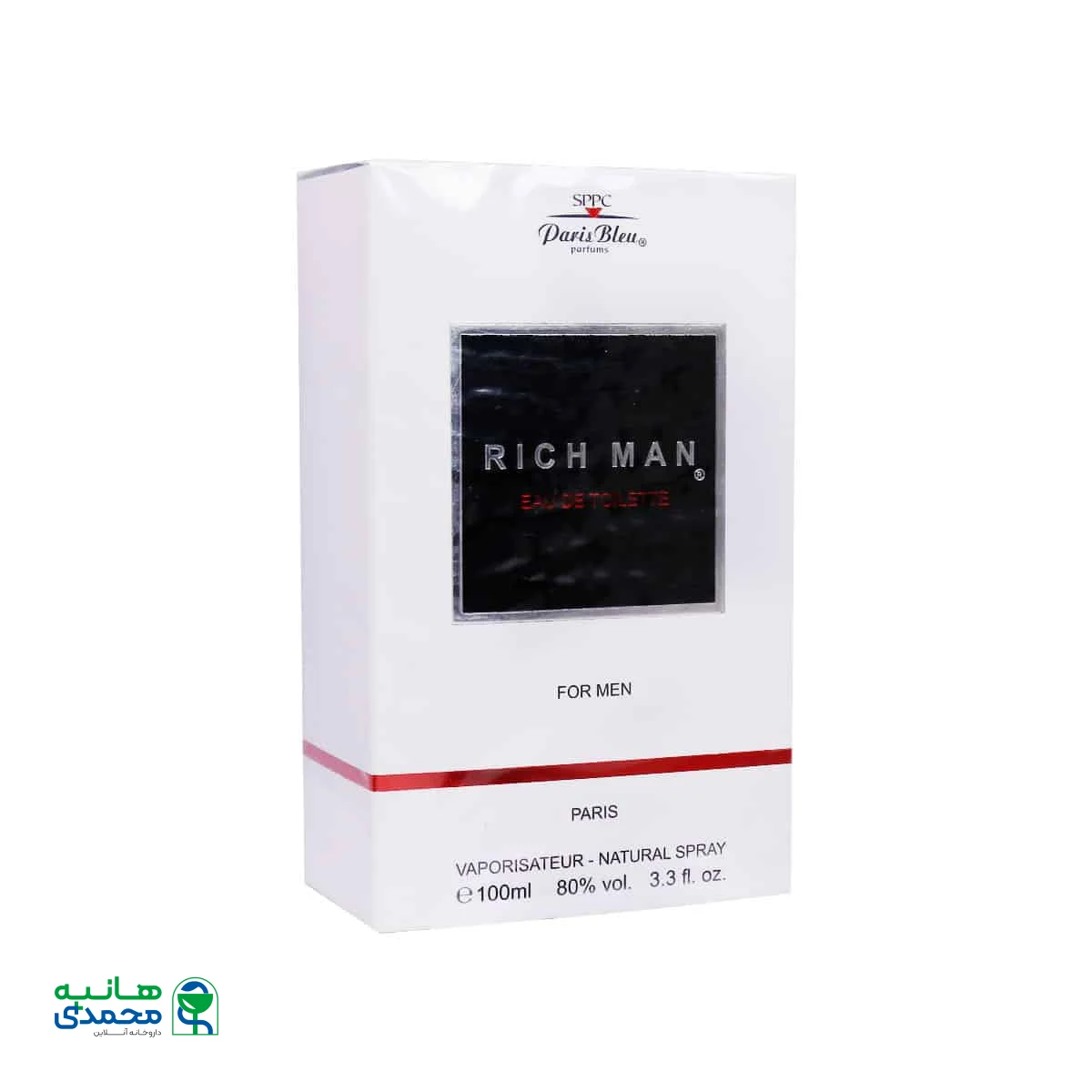 ادوتویلت مردانه ریچ من پاریس بلو ساخت کشور فرانسه است و رایحهای تلخ و ملایم دارد. نت آغازین این محصول بویی مشابه ترنج، گلابی و هل دارد و پس از مدتی رایحهی خود را با بوی اسطوخودوس، بنفشه و فلفل صورتی تعویض میکند. سدر، پرتقال تلخ، کشمران، چوب صندل و پرالین نتهای پایانی ادوتویلت مردانه ریچ من پاریس بلو هستند. این محصول همچون سایر ادوتویلتها حاوی 5 الی 15 درصد روغن معطر بوده و بین 3 الی 5 ساعت ماندگاری دارد. ادوتویلت مردانه پاریس بلو مدل Rich Man، در گروه بویایی مرکبات، میوهای و چوبی قرار میگیرد و حس مثبتی را در افراد به وجود میآورد. استفاده از این محصول در فصلهای گرم سال همچون تابستان، توصیه میشود.
