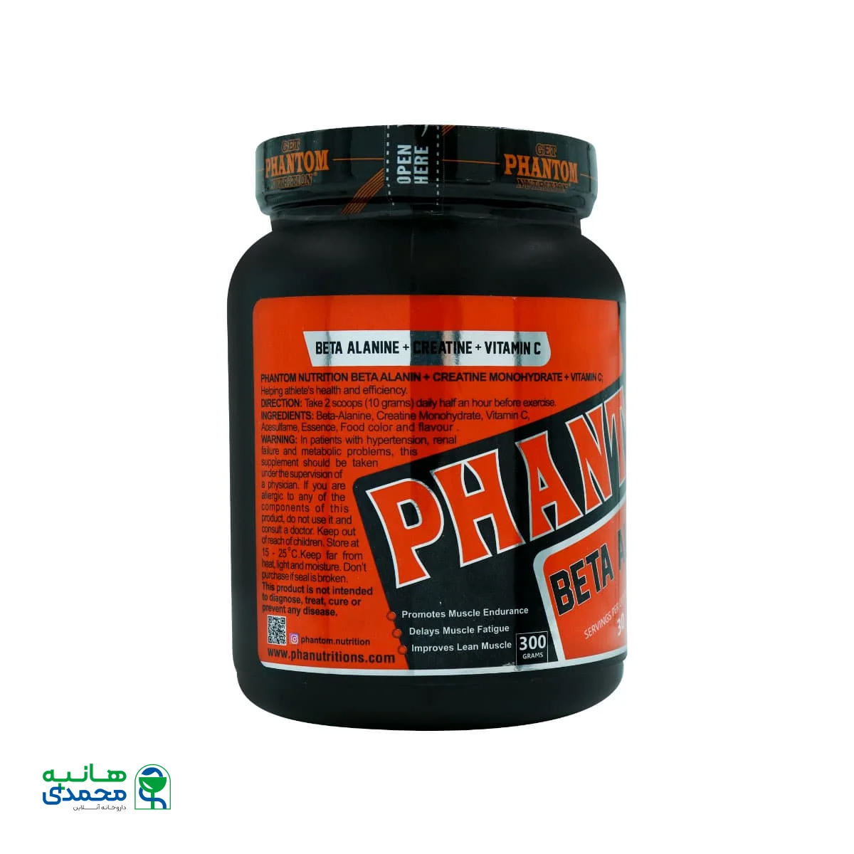 پودر بتا آلانین کراتین و ویتامین C فانتوم نوتریشن یک مکمل موثر جهت افزایش کارایی ورزشکار است. بتا آلانین ترکیبی از کارنوسین بتاآلانین و آمینو اسید ال هیستیدین است که در تاخیر خستگی عضلات ناشی از انجام حرکات توسط ورزشکار جلوگیری می‌کند. این مکمل به واسطه دارا بودن ویتامین C موجود در آن یک آنتی اکسیدان بسیار قوی است که رادیکال‌های آزاد بدن را از بین می‌برد.