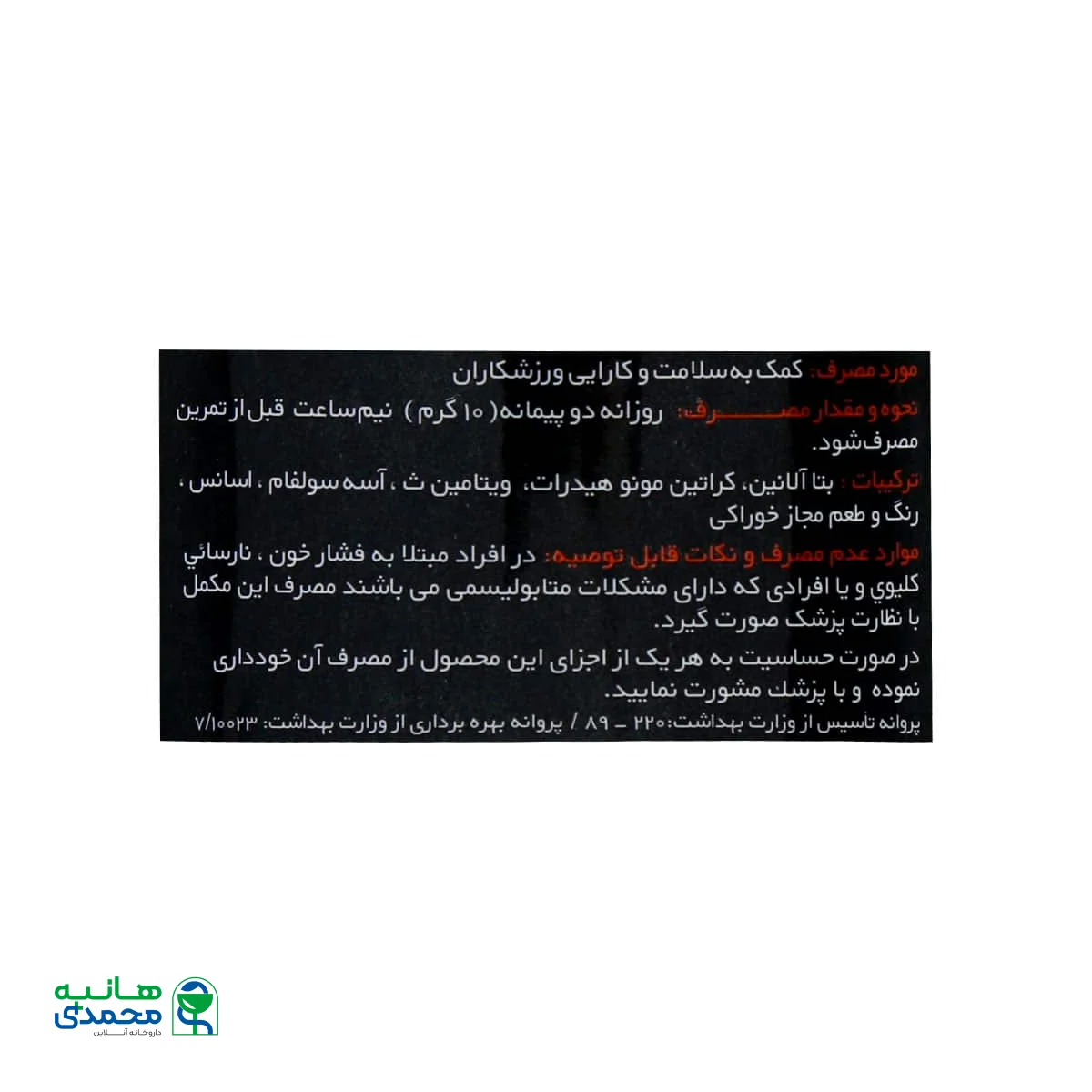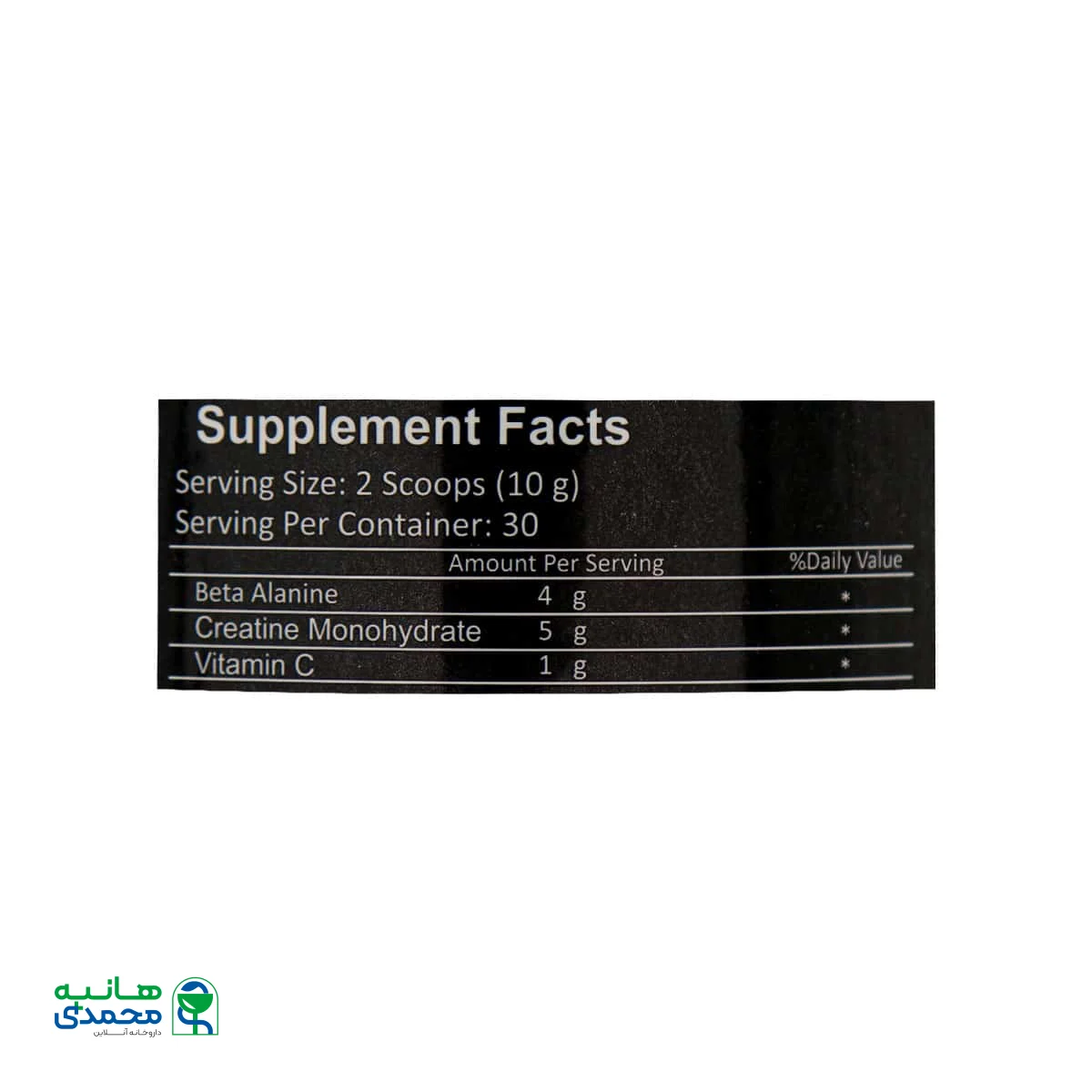 بتا آلانین، کراتین مونوهیدرات، ویتامین ث، آسه سولفام، اسانس رنگ و طعم مجاز خوراکی