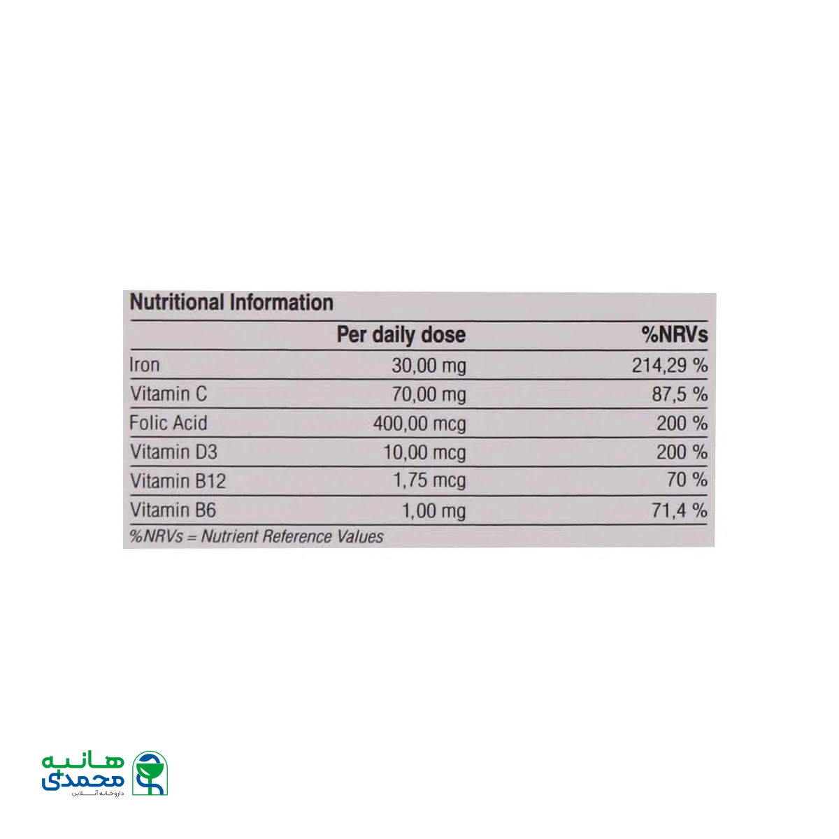 آهن سوکروزومیال، نشاسته ذرت، ژلاتین خوراکی، ویتامین C، ویتامین د3، ویتامین ب12، ویتامین ب6، فولیک اسید، تیتانیوم دی اکسید، اکسید آهن قرمز.