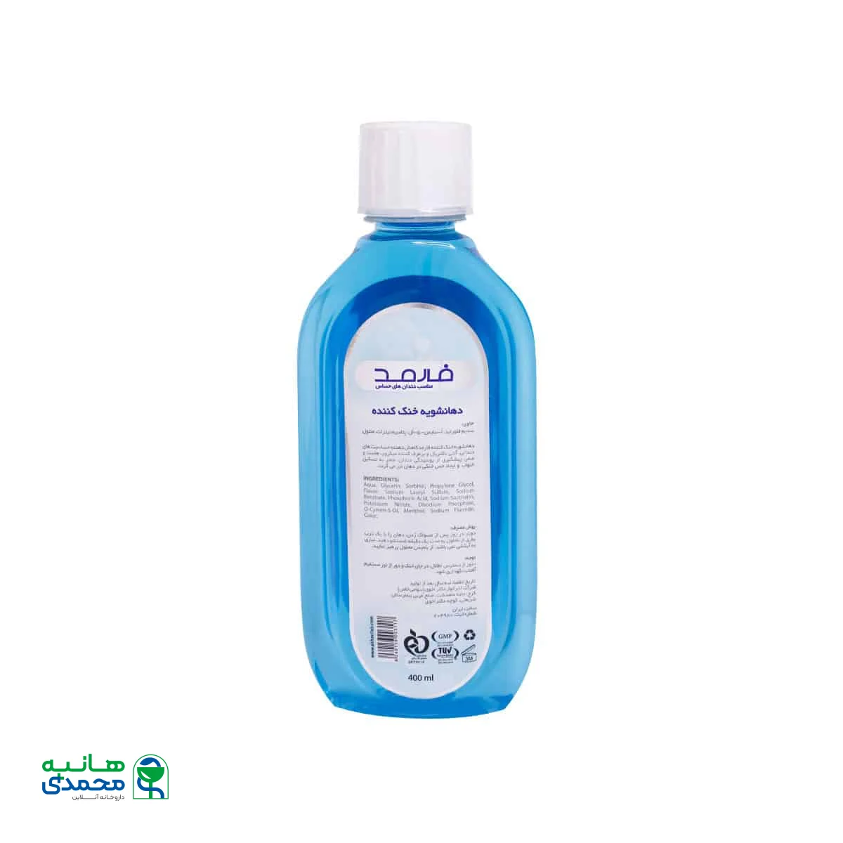 دهانشویه خنک کننده فارمد فاقد الکل بوده و بااستفاده روزانه علاوه بر مسواک زدن برای مبارزه با پلاکهای دندان و رفع بوی بد دهان مورد استفاده قرار میگیرد. دهان شویه خنک کننده فارمد، حساسیتهای دندانی شما را کاهش میدهد و در مقایسه با لاین سنسوداین خارجی که برای رفع حساسیت دندان مورد استفاده قرار میگرفت یکی از بهترین دهانشویهها برای رفع حساسیت لثه و دندان به شمار میآید. از دیگر ویژگیهای این دهانشویه که آن را از دیگر دهان شویهها متمایز کرده است میتوان به طعم نعنای فوق العاده اشاره کرد که پس از استفاده از آن طراوت و احساس تمیزی بیشتر را در دهان تجربه میکنید. نعناع خواص ضد عفونی کننده، آنتی باکتریال، ضد قارچ و ضد میکروبی دارد. همچنین خشکی دهان که یکی از علتهای مهم بوی بدن دهان است را از بین میبرد.