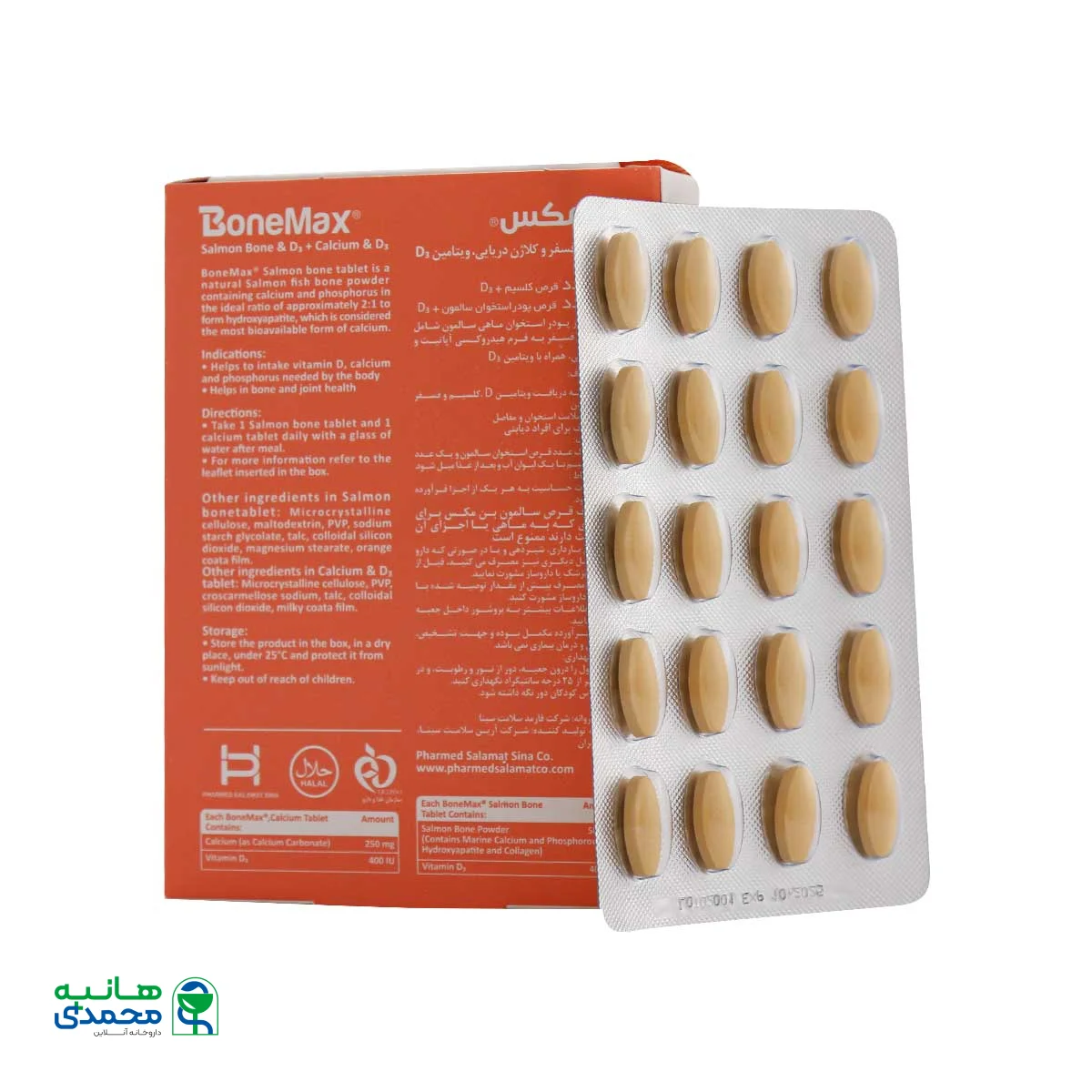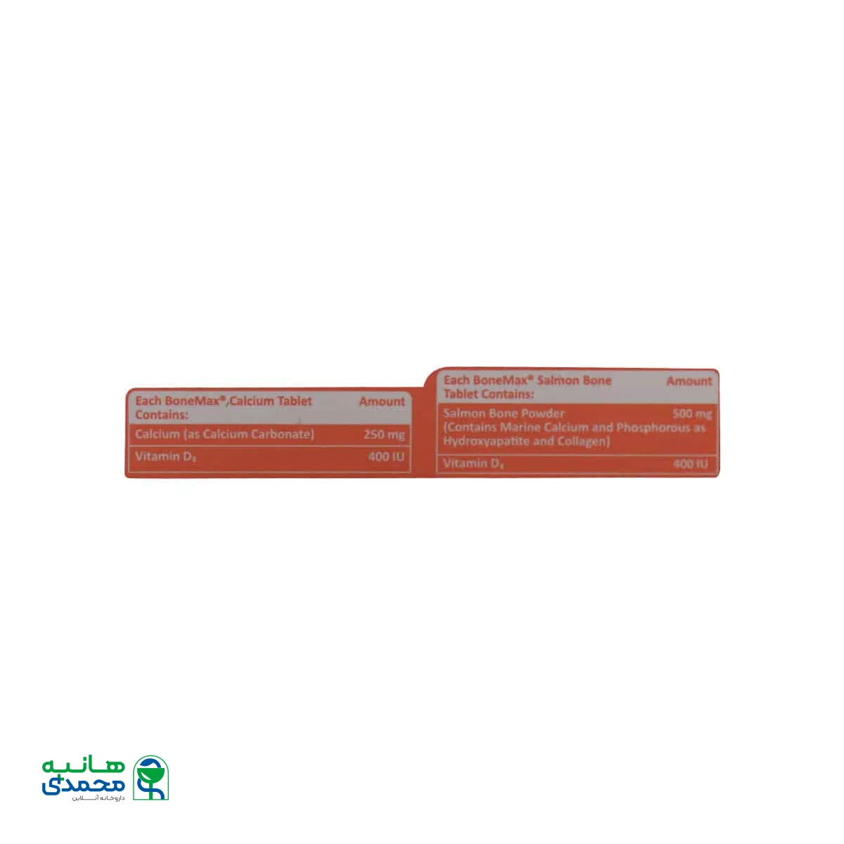 بن مکس حاوی کلسیم و فسفر در نسبت ایده آل 2 به 1 و به فرم هیدروکسی آپاتیت است. استخوان ماهی سالمون به طور طبیعی دارای مقادیر بالای کلسیم، فسفر و کلاژن است و مطالعات نشان میدهند که این ماده قابلیت ویژهای در کمک به سلامت استخوان و ساخته شدن استخوان جدید دارد. در مکمل بن مکس 2 عدد بلیستر نارنجی رنگ 20 عددی قرص روکش دار پودر استخوان سالمون + ویتامین D3 و 2 عدد بلیستر طلایی رنگ 20 عددی قرص روکش دار کلسیم + ویتامین D3 موجود است.
