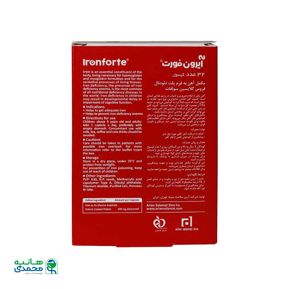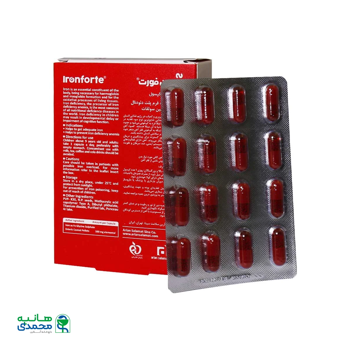 هر کپسول آیرون فورت حاوی 100 میلی گرم آهن خالص به فرم فروس گلایسین سولفات است که برای پیشگیری و درمان کم خونی فقر آهن کاربرد دارد.  اکثر افرادی که از مکمل های آهن حتی آیرون فورت خارجی استفاده می‌کنند، دچار مشکلات گوارشی می‌شوند. قرص آیرون فورت دئودنال با پلت‌های دارای پوشش روده‌ای تهیه شده است که کمترین عوارض گوارشی دارد. داروهایی که پوشش روده ای دارند، تحت تاثیر محیط اسیدی معده قرار نمی‌گیرند و در معده باز نمی‌شود. این داروها در محیط قلیایی دوازدهه آزاد شده و جذب خون می‌شوند. به این ترتیب مشکلات گوارشی ایجاد نخواهد کرد. از دیگر مزایای کپسول آهن آیرون فورت ایرانی سینا می توان به جذب بهتر، تداخل کمتر با املاح دیگر و عوارض گوارشی کمتر اشاره کرد.