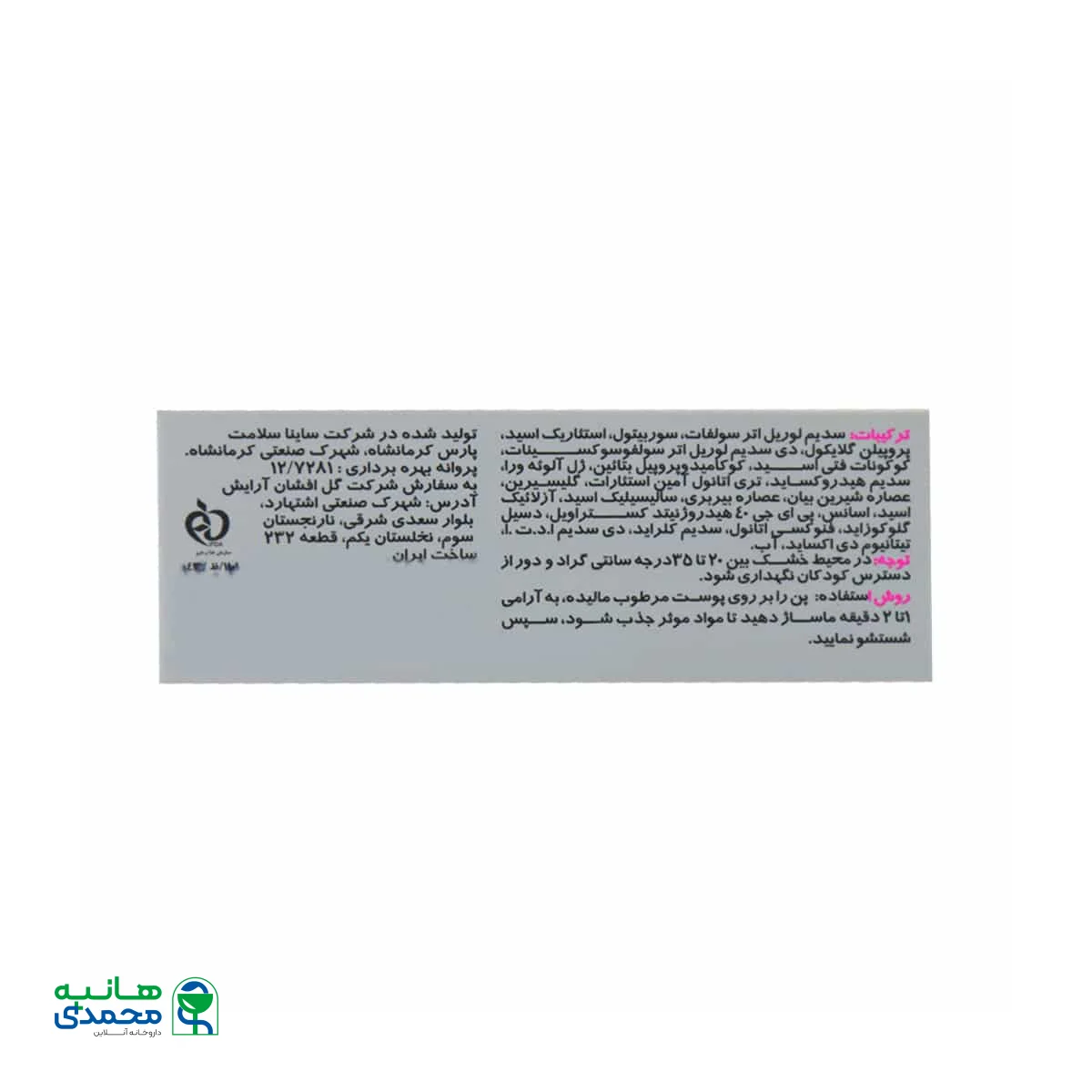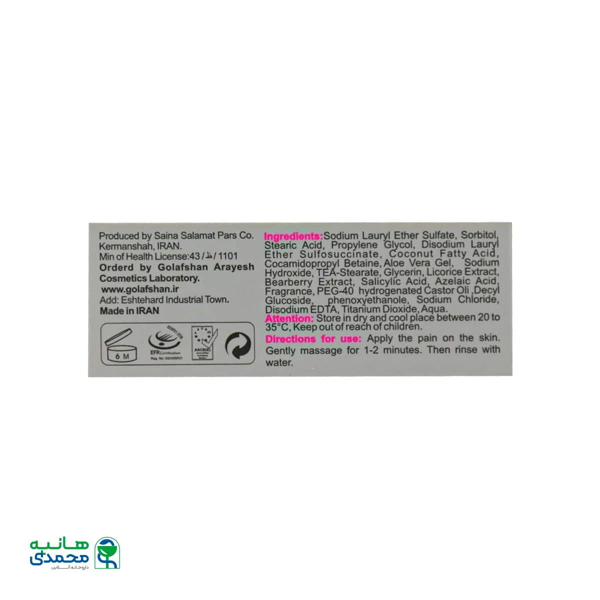 پن را بر روی پوست مرطوب مالیده، به آرامی چند دقیقه ماساژ دهید تا مواد موثر جذب شود، سپس شستشو نمایید.