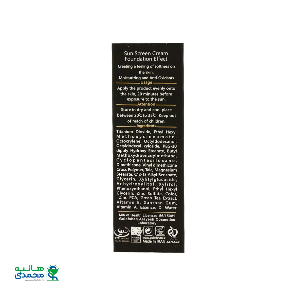 تیتانیم دی اکساید، اتیل هگزیل متوکسی سینامات، اکتوکرایلن، اکتیل دودکانول، اکتیل دودسیل زایلوزید، PEG-30 دی پلی هیدروکسی استئارات، بوتیل متوکسی دی بنزوئیل متان، سیکلوپنتاسیلوکسان، دایمتیکون، وینیل دایمتیکون کراس پلیمر، تالک، منیزیم استئارات، C12-15 آلکیل بنزوات، گلیسرین، زایلیتیل گلوکوزاید، آن هیدروکسی لیتول، زایلیتول، فنوکسی اتانول، اتیل هگزیل گلیسرین، زینک سولفات، رنگ، زینگ PCA، عصاره چای سبز، ویتامین E، زانتان گام، ویتامین A، اسانس، آب دیونیزه
