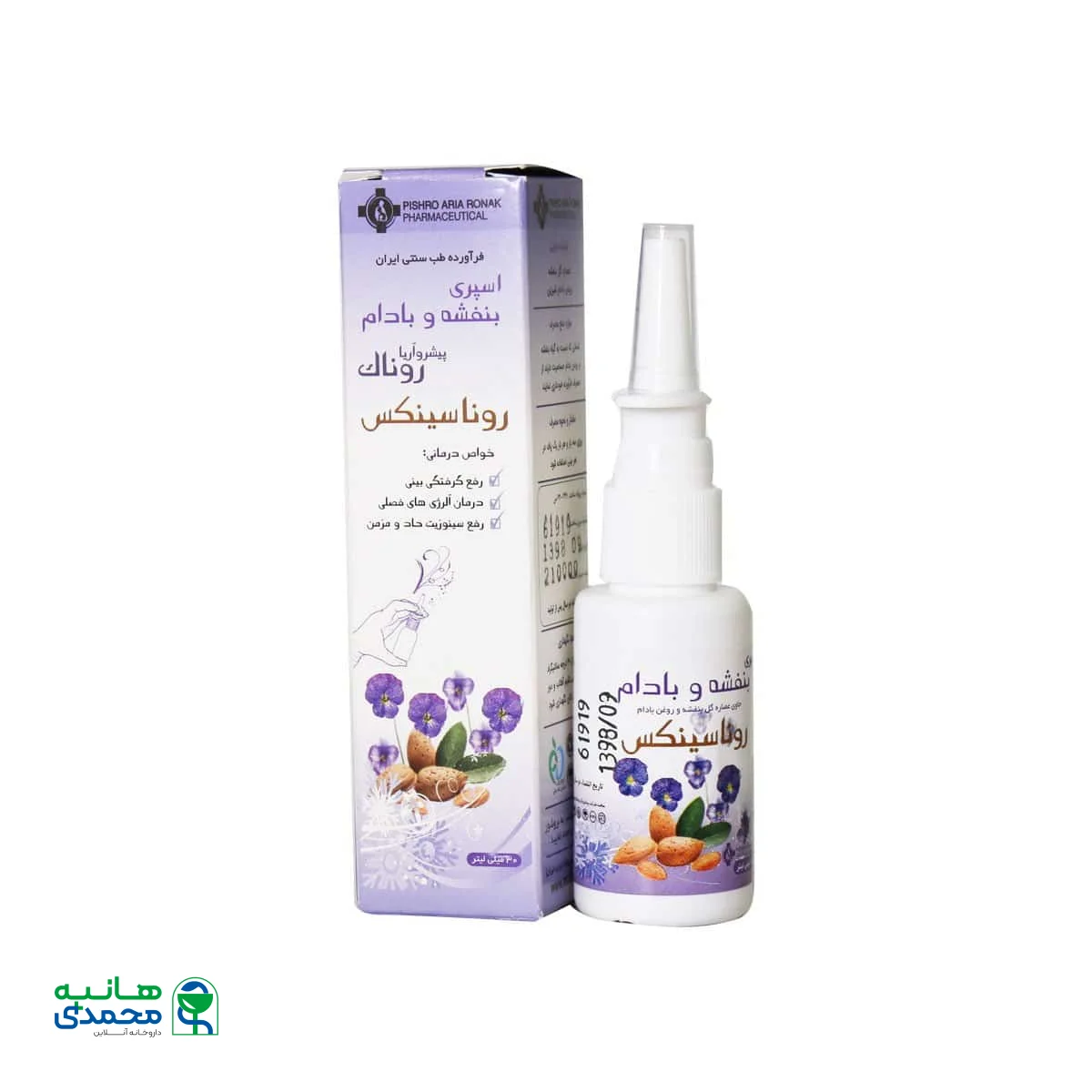 اسپری بنفشه و بادام روناسینکس پیشرو آریا روناک یک محصول گیاهی متشکل از عصاره گل بنفشه با نام علمی Viola odorata و روغن بادام شیرین Prunus amygdalus است. با شروع فصل سرما و سرماخوردگی بسیاری از افراد به بیماری های سرماخوردگی و آنفولانزا و در فصول پاییز و بهار به حساسیت مبتلا میشوند. یکی از مشکلاتی که در حین سرماخوردگی با آن مواجه هستیم، آبریزش و گرفتگی بینی است. این محصول با دارا بودن روغن بنفشه و بادام سبب جلوگیری از آبریزش بینی شده و گرفتگی بینی را برطرف می کند و داروی مناسب برای درمان آلرژیهای فصلی و رفع سینوزیت مزمن است.
