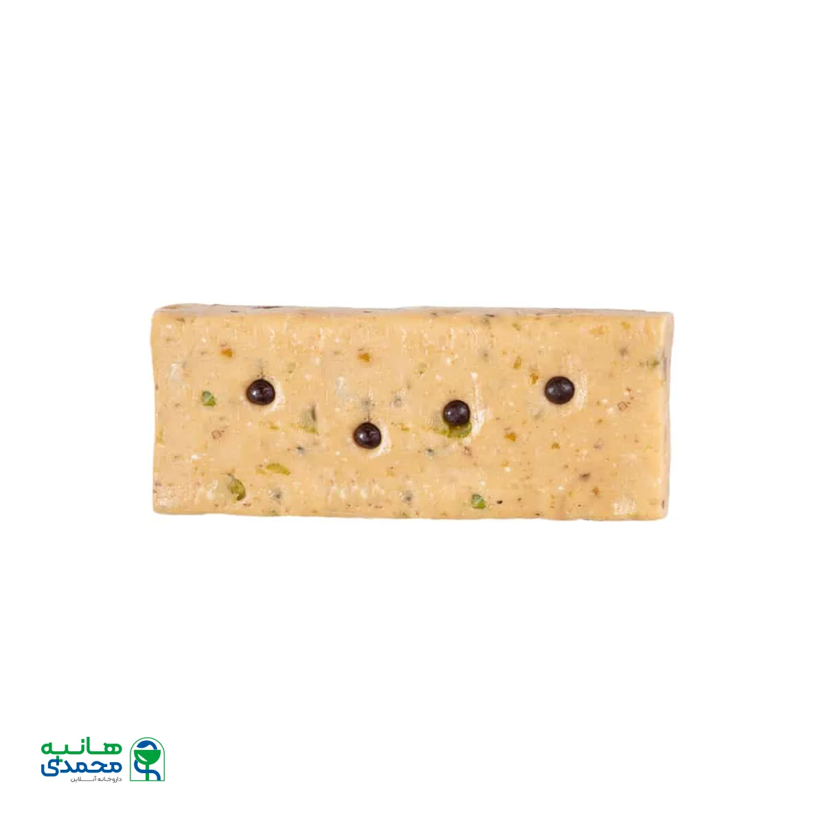 پروتئین سویا، پودر پروتئین تغلیظ شده شیر mpc، گلکوز بابریکس 80، آلبومین، شیر خشک، پروتئین وی، پسته، کره بادام زمینی، شکلات، عسل، کره گیاهی مارگارین، لسیتین، نرم کننده مجاز خوراکی (سوربیتول)، طعم دهنده مایع مشابه طبیعی مجاز خوراکی، اسانس