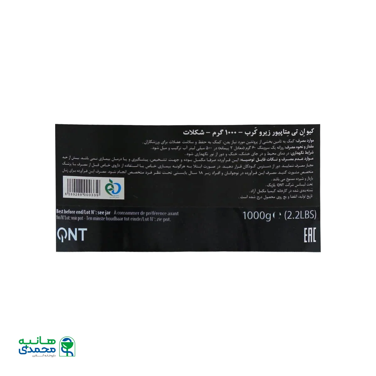 پودر پروتیین متاپیور زیرو کرب کیو ان تی صرفا مکمل تغذیه ای بوده و جهت تشخیص، پیشگیری و یا درمان بیماری نیست.