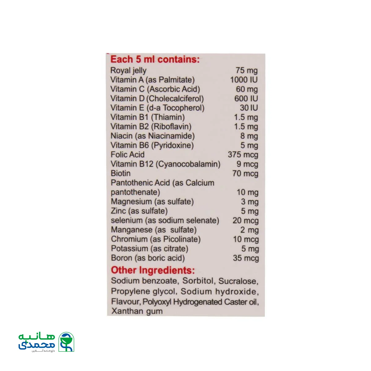 | ترکیبات | مقدار در هر 5 میلی لیتر | درصد نیاز مصرف روزانه |