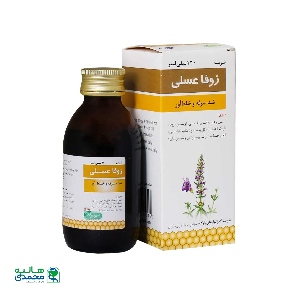 شربت زوفا عسلی رازک یکی از محصولات گیاهی موثر در درمان سرماخوردگی، سرفه و گلودرد بوده که می‌تواند شدت آن را کاهش دهد و به مرور موجب درمان مشکلات ناشی از آن شود. همچنین از داروی زوفا می‌توان برای بهبود سرفه‌های سابقه طولانی، تنگی نفس و حساسیت هم استفاده کرد. می‌توان زوفا عسلی را به واسطه ترکیبات گیاهی موثرش بهترین شربت سرماخوردگی کودکان و بزرگسالان دانست.