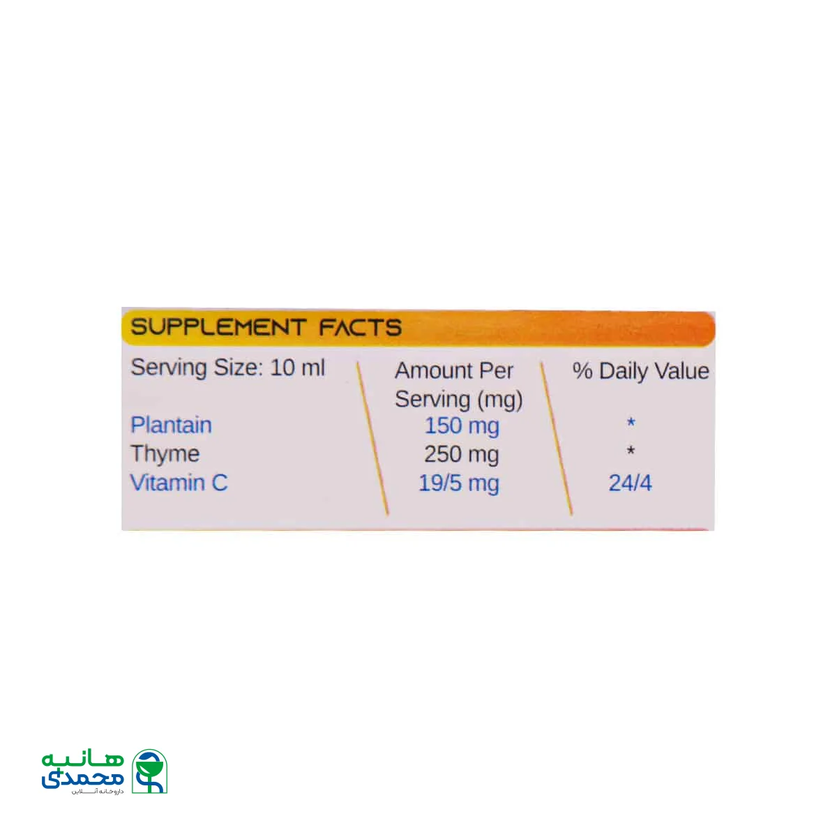آب، گلیسیرین، سوربیتول، ویتامین سی، عصاره بارهنگ، عصاره آویشن، سیتریک اسید، پتاسیم سوربات.