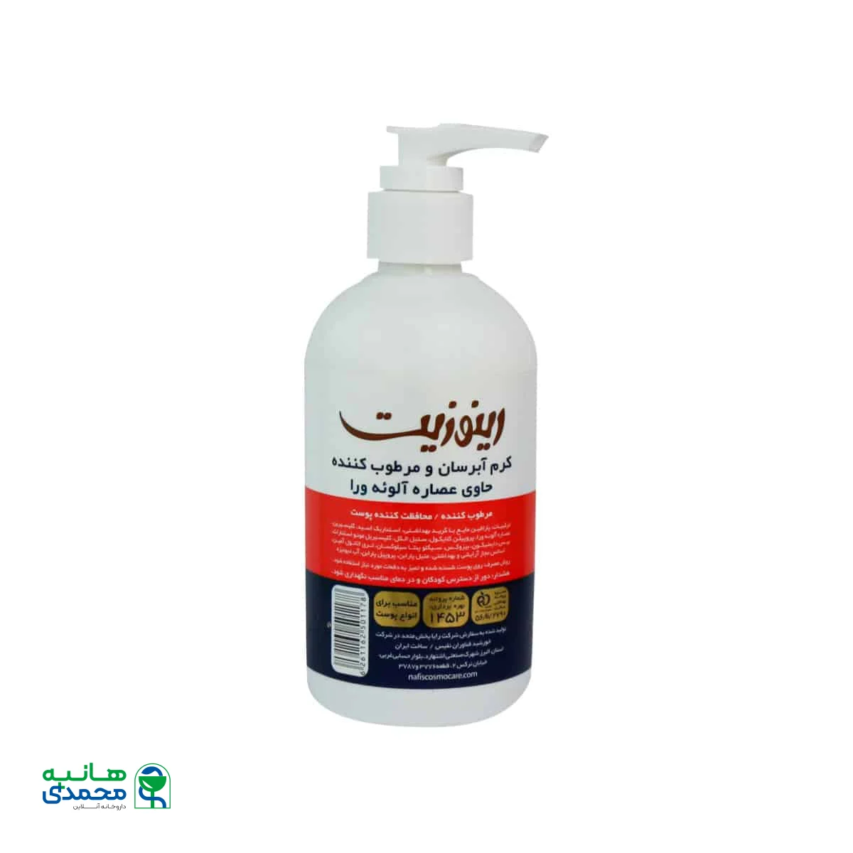 کرم آبرسان و مرطوب کننده عصاره آلوئه ورا رینوزیت محصولی مغذی برای تقویت و مراقبت از پوست تمام بدن است. پوست انسان در مواجهه با عواملی مانند سرما و گرما، افزایش سن، رادیکال‌های آزاد و… به مرور زمان خاصیت کشسانی خود را از دست می‌دهد و چروک می‌شود. برای جلوگیری از این مشکل یا به تعویق انداختن آن می‌توان خرید کرم‌ مرطوب کننده و آبرسان را مد نظر داشت. کرم عصاره آلوئه ورا رینوزیت به شکل پمپی وارد بازار شده و به راحتی پاسخگوی همه نیازهای پوستی شماست. این محصول با اکسیژن رسانی به سلول‌های پوستی خاصیت ضد التهابی دارد و می‌توان حتی برای ترمیم و بهبود هرچه سریعتر زخم‌های سطحی هم از آن بهره برد. با استفاده از این کرم فیبروبلاست‌ها تحریک شده و در نتیجه تولید الاستین و کلاژن اتفاق می‌افتد که باعث حفظ حالت ارتجاعی و کشسانی پوست می‌شوند.