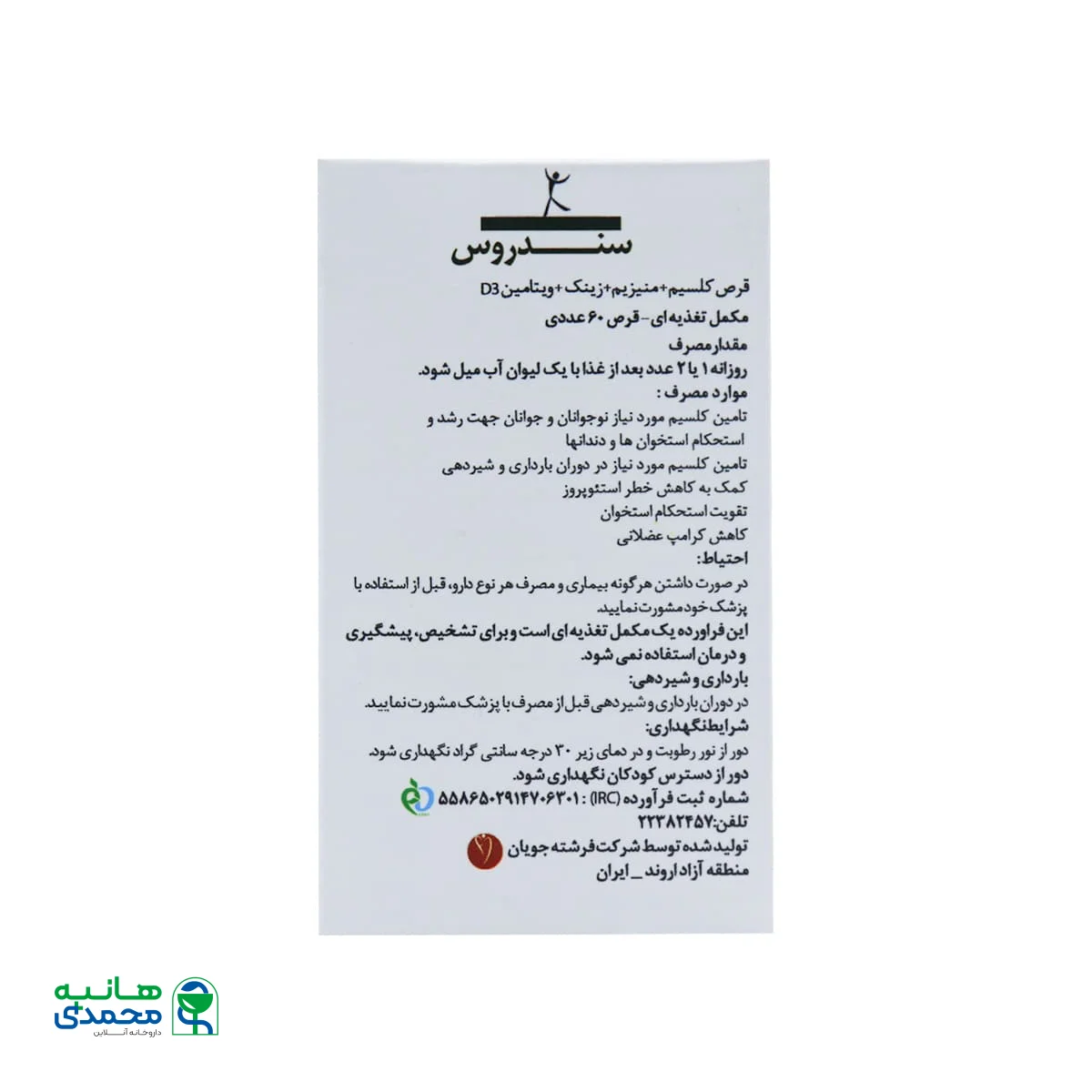قرص کلسیم و منیزیم و زینک و ویتامین D3 سندروس مکمل غذایی بوده و جهت تشخیص، پیشگیری و یا درمان نیست.