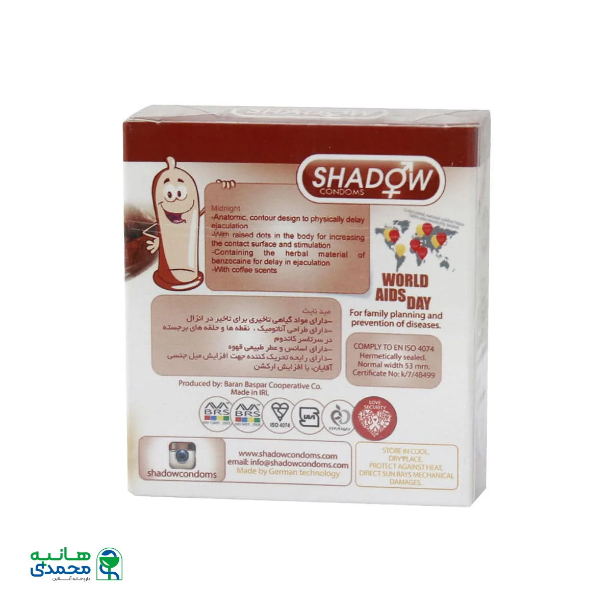 کاندوم شادو مدل Midnight دارای ترکیبات تاخیری جهت تاخیر در روند انزال است. این کاندوم از برند ایرانی شادو دارای طراحی آناتومیک، نقطهها و حلقههای برجسته در سرتاسر کاندوم است. به علاوه اسانس و عطر طبیعی قهوه کاندوم میدنایت جهت افزایش میل جنسی بسیار تحریک کننده خواهد بود. همانطور که میدانید کاندوم یک پوشش نازک پلاستیکی است که در زمان رابطه جنسی توسط مردان استفاده میشود. خرید و اطلاع از قیمت کاندوم به عنوان یک مانع جهت پیشگیری از ابتلا به بیماریهای مقاربتی و حاملگی ناخواسته به شمار مییابد.