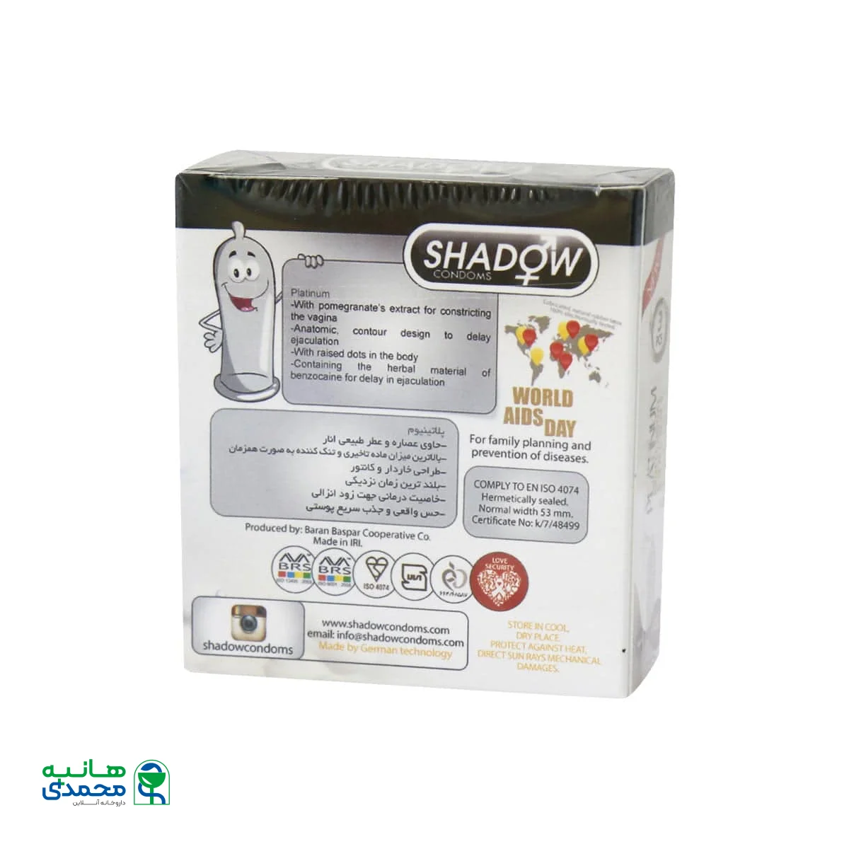 کاندوم تاخیری و خاردار شادو مدل Platinum مناسب افرادی است که به استفاده از کاندوم در زمان رابطه جنسی تمایلی ندارند چون نازک و شفاف بودن این کاندوم باعث میشود که پوششی روی آلت احساس نکنند. مواد کاملا چرب و لغزنده این محصول باعث میشود خانمها در هنگام مقاربت دردی را متوجه نشوند تا رطوبت ناحیه تناسلی کاملا حفظ و افزایش یابد. ساختار بنزوکائین کاندوم پلاتینیوم کاملا بی ضرر و ضد حساسیت بوده و از پاره شدن و ماندن کاندوم در واژن جلوگیری میکند. علاوه بر داشتن مواد تاخیری بالا برای جلوگیری از انزال زودرس، از عصاره انار هم برای تنگ شدن واژن در هنگام رابطه جنسی استفاده شده است. به دلیل تامین امنیت بیشتر در انتهای این کاندوم محلی برای ذخیره اسپرم و ایجاد مقاربت امن قرار دارد تا مانع از ورود اسپرم و بارداری ناخواسته شود.