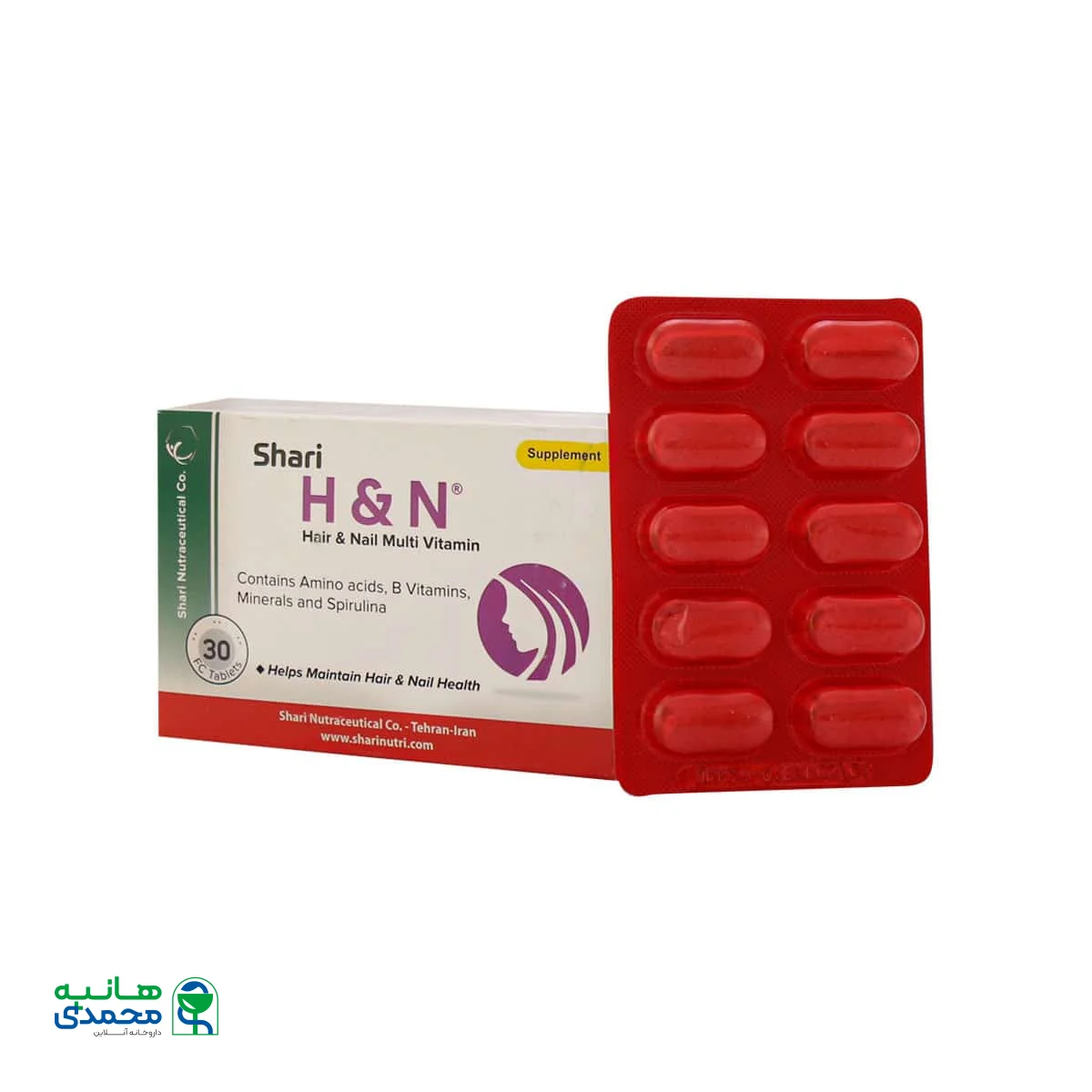 قرص اچ اند ان شاری یک مکمل حافظ سلامت مو و ناخن است. این محصول حاوی اسیدهای آمینه، ویتامینهای گروه ب و املاح و اسپیرولینا است. اسید آمینه ال- سیستئین موجود در این فرآورده با داشتن گروه تیولی، به گروههای تیولی سایر اسیدهای آمینه سیستئین متصل شده و پلهای دی سولفیدی تشکیل میدهند. این پلها به پروتئینهای ساختاری و آنزیمها کمک میکنند تا استحکام و ساختار فضایی خود را حفظ کنند.