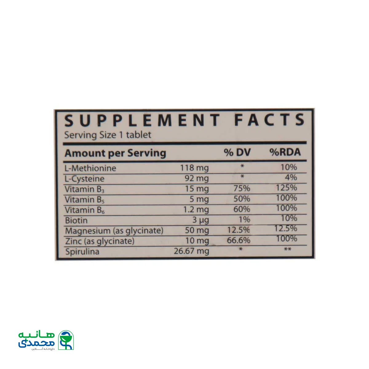 ویتامینB5 همراه با سایر ویتامینهای گروه B در رفع شوره سر بسیار مؤثر است. ویتامین ب6 در ساخت سیستئین نقش دارد و به این ترتیب در حفظ سلامت مو و ناخن مؤثر است. بیوتین این فرآورده باعث تحریک تشکیل کراتین که بخش مهمی از ساختار مو است، میشود. این ماده رشد مو و ناخن را افزایش داده و رطوبت و استحکام آنها را حفظ میکند. منیزیم به عنوان یک عنصر حیاتی جهت عملکرد صحیح سلولهای بدن بوده و موجب بهبود خون رسانی به پوست میشود. زینک موجود در مکمل پوست مو ناخن یک آنتی اکسیدان است که از پوست و مو در برابر آسیبهای اکسیداتیو محافظت مینماید. اسپیرولینا یک جلبک سبز آبی است که منبع غنی از ویتامینهای آ و ب12 است. این جلبک بطور طبیعی حاوی اسیدهای چرب نظیر لینولنیک است که خواص بسیار زیادی برای سلامتی دارد.