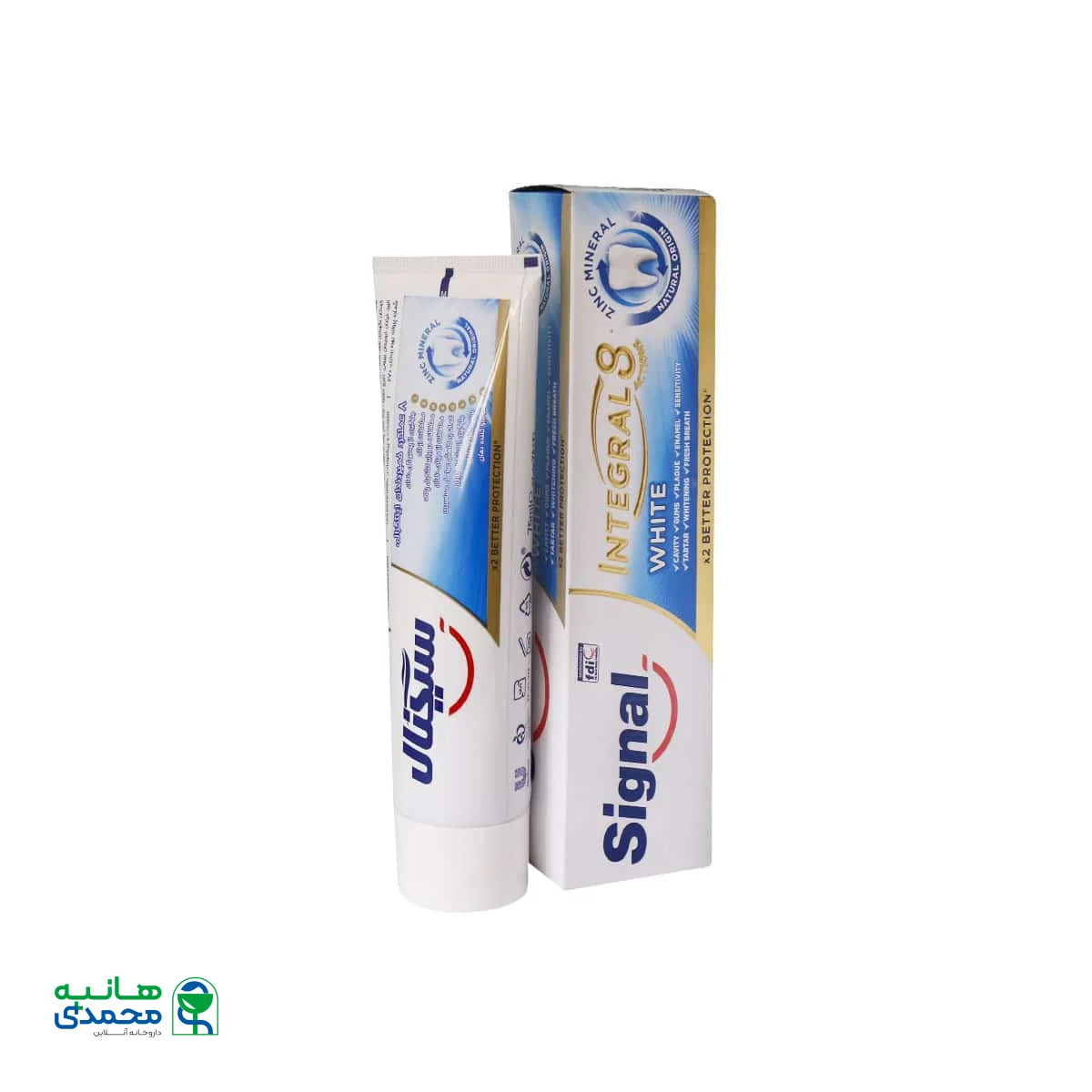 خمیر دندان اینتگرال 8 سفید کننده سیگنال با ایجاد فسفات و کلسیم لازم برای مینای دندان، سبب پر شدن فرورفتگیها و حفرههایی که توسط پلاکهای میکروبی ایجاد شدهاند، میشود.