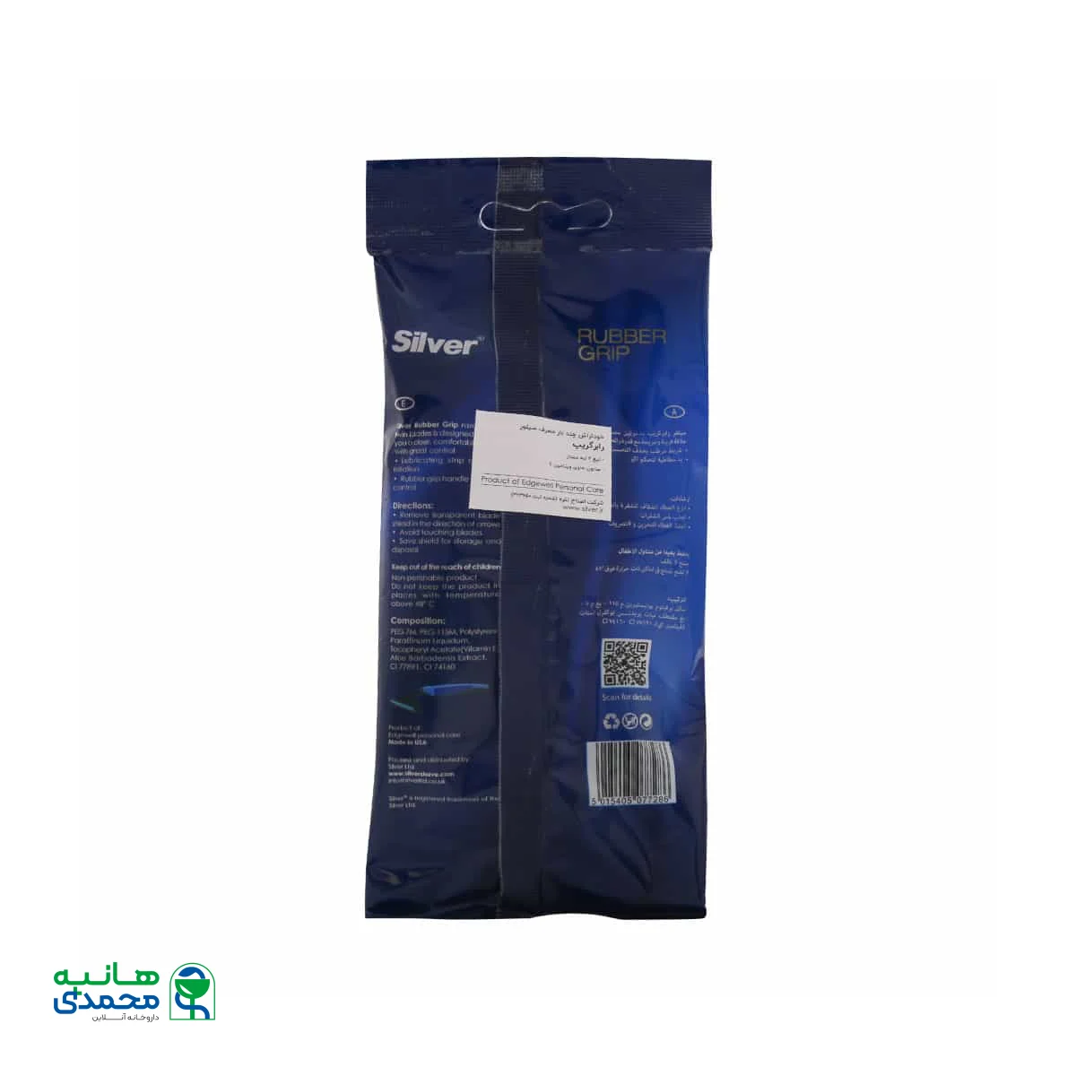 خودتراش چند بار مصرف 2 لبه مردانه رابر گریپ سیلور یک تیغ صورت تراشی یکبار مصرف از برند Silver است. این خودتراش مجهز به دو لبه تیغ از جنس استیل و دسته گریپ دار ضد لغزش بوده که اصلاحی آسان و دقیق را برای شما فراهم می‌کند. در بالای ژیلت 2 لبه مردانه سیلور مدل Rubber Grip یک نوار ژل حاوی ویتامین E قرار گرفته است که به لطافت و نرمی پوست و همچنین سر خوردن راحت تیغ روی آن کمک می‌کند. فاصله نزدیک تیغه‌ها در این خودتراش نیز به اصلاح دقیق‌تر کمک می‌کند. با خرید تیغ رابر گریپ مردانه سیلور می‌توانید اصلاح دقیق و آسانی را تجربه کنید و امکان استفاده چندین بار مصرف این تیغ با یک بار هزینه فراهم می‌کند.