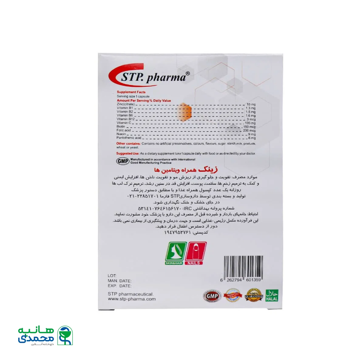 کپسول زینک پلاس همراه ویتامین ها اس تی پی فارما با داشتن مقادیر مناسبی از زینک و ویتامینها، در تقویت سلامت عمومی شما موثر است. این محصول با دارا بودن مقادیر مناسبی از ویتامین C و B کمپلکس، بدن شما را تقویت کرده و در وهله اول از ریزش موی شما جلوگیری میکند. امروزه ریزش مو به معضلی بزرگ در بین جوانان و افراد میانسال تبدیل شده است؛ حتی خانمها نیز گاهی اوقات از ریزش مو رنج میبرند.